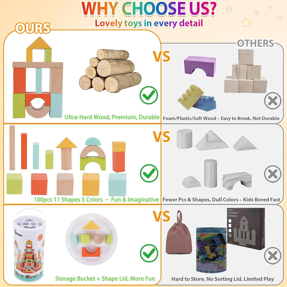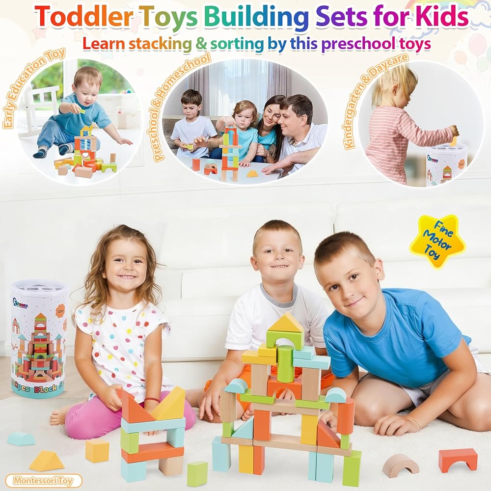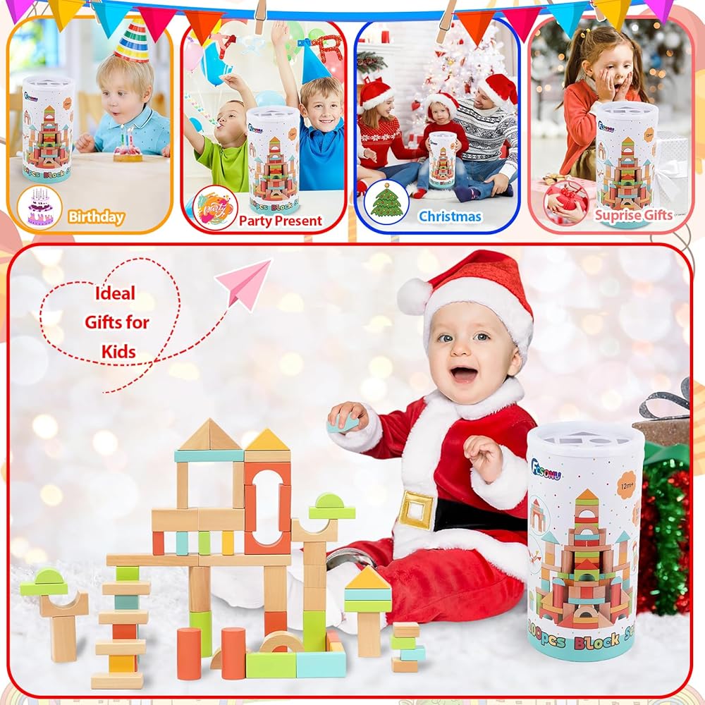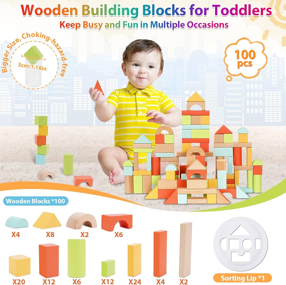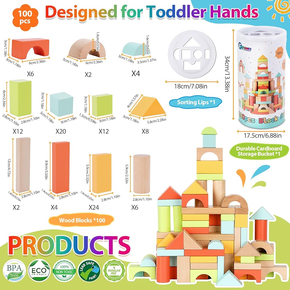 مكعبات بناء خشبية للأطفال الصغار من عمر 1 إلى 3 أعوام من FCSONU، مجموعة مكعبات خشبية 100 قطعة - ألعاب الفرز والتكديس مع مساحة تخزين وغطاء، ألعاب مونتيسوري للأطفال من عمر عامين فما فوق، هدايا عيد الميلاد الأول للأولاد والبنات والأطفال