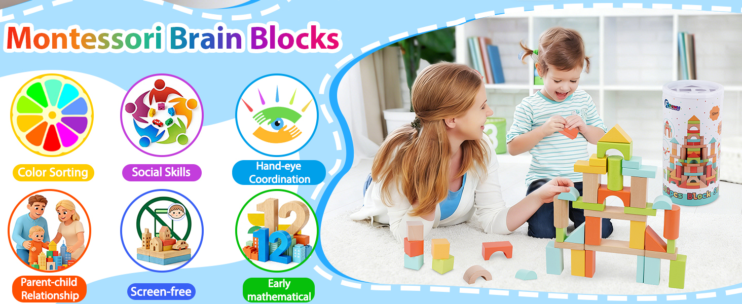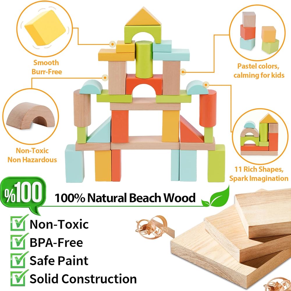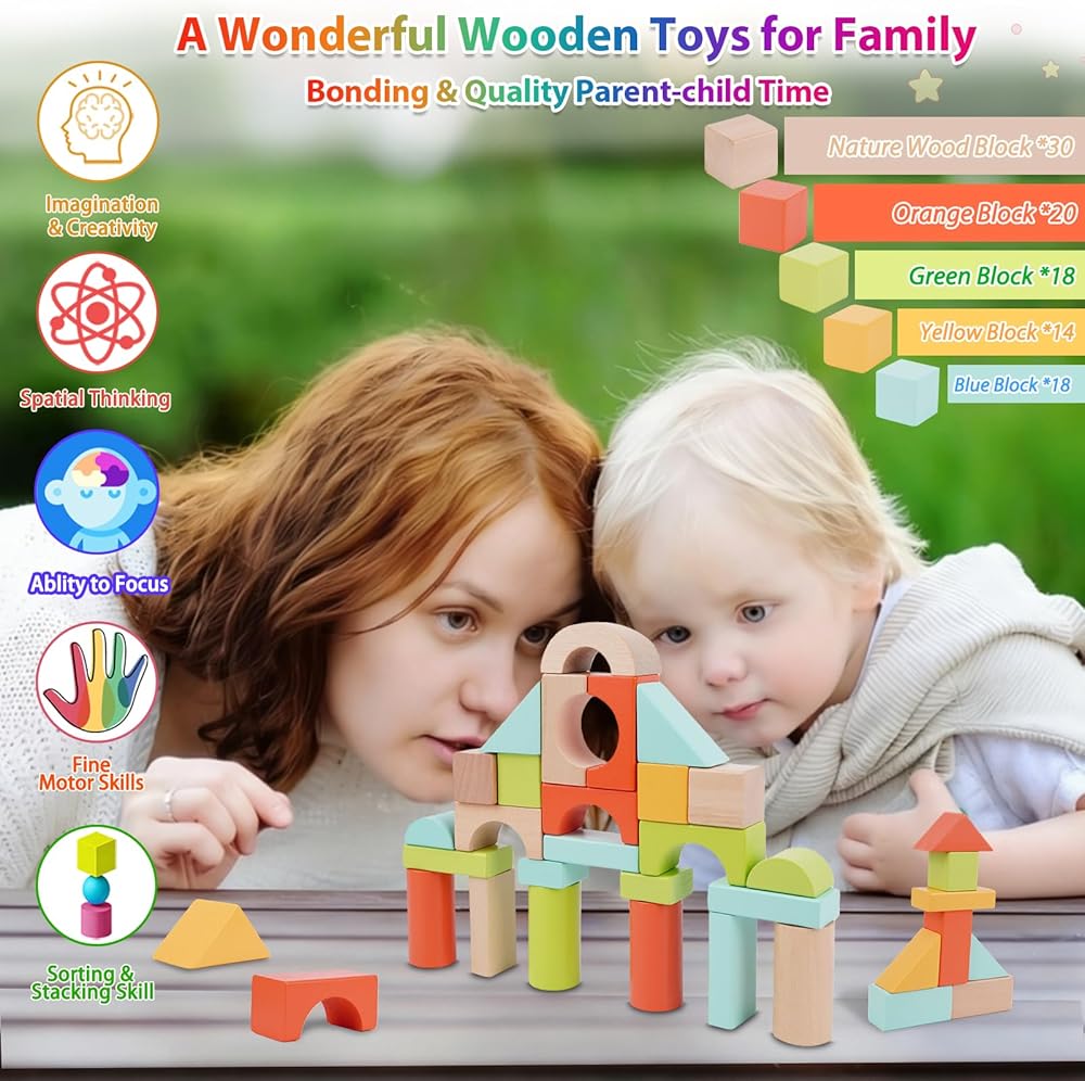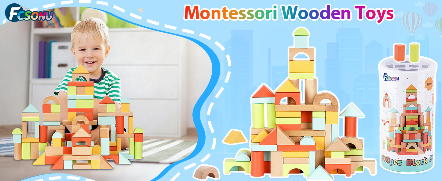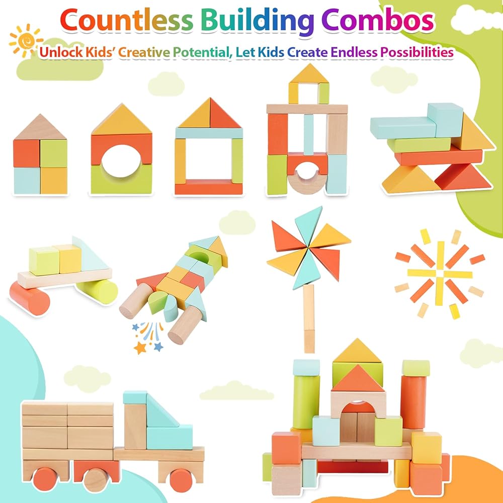 مكعبات بناء خشبية للأطفال الصغار من عمر 1 إلى 3 أعوام من FCSONU، مجموعة مكعبات خشبية 100 قطعة - ألعاب الفرز والتكديس مع مساحة تخزين وغطاء، ألعاب مونتيسوري للأطفال من عمر عامين فما فوق، هدايا عيد الميلاد الأول للأولاد والبنات والأطفال