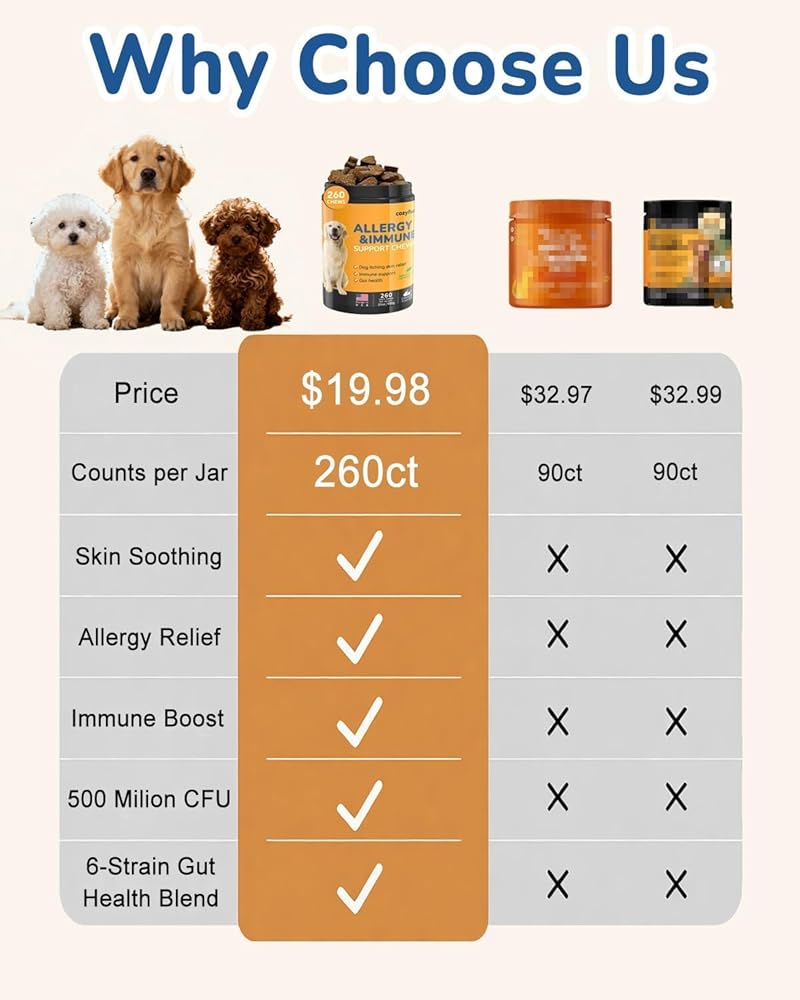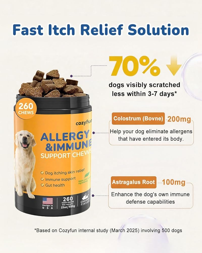 ✔【دعم طويل الأمد للحساسية】: مع زجاجة كبيرة بحجم 23oz تحتوي على 260 مضغًا، يوفر هذا المنتج حجمًا أكبر بمقدار 2.5 مرة من العلامات التجارية العادية. مثالي للكلاب المتوسطة والكبيرة لمدة تصل إلى 70 يومًا، أو للكلاب الصغيرة لمدة تصل إلى 180 يومًا. حل فعال من حيث التكلفة لتخفيف حساسية الكلاب وأدوية الحساسية للكلاب.