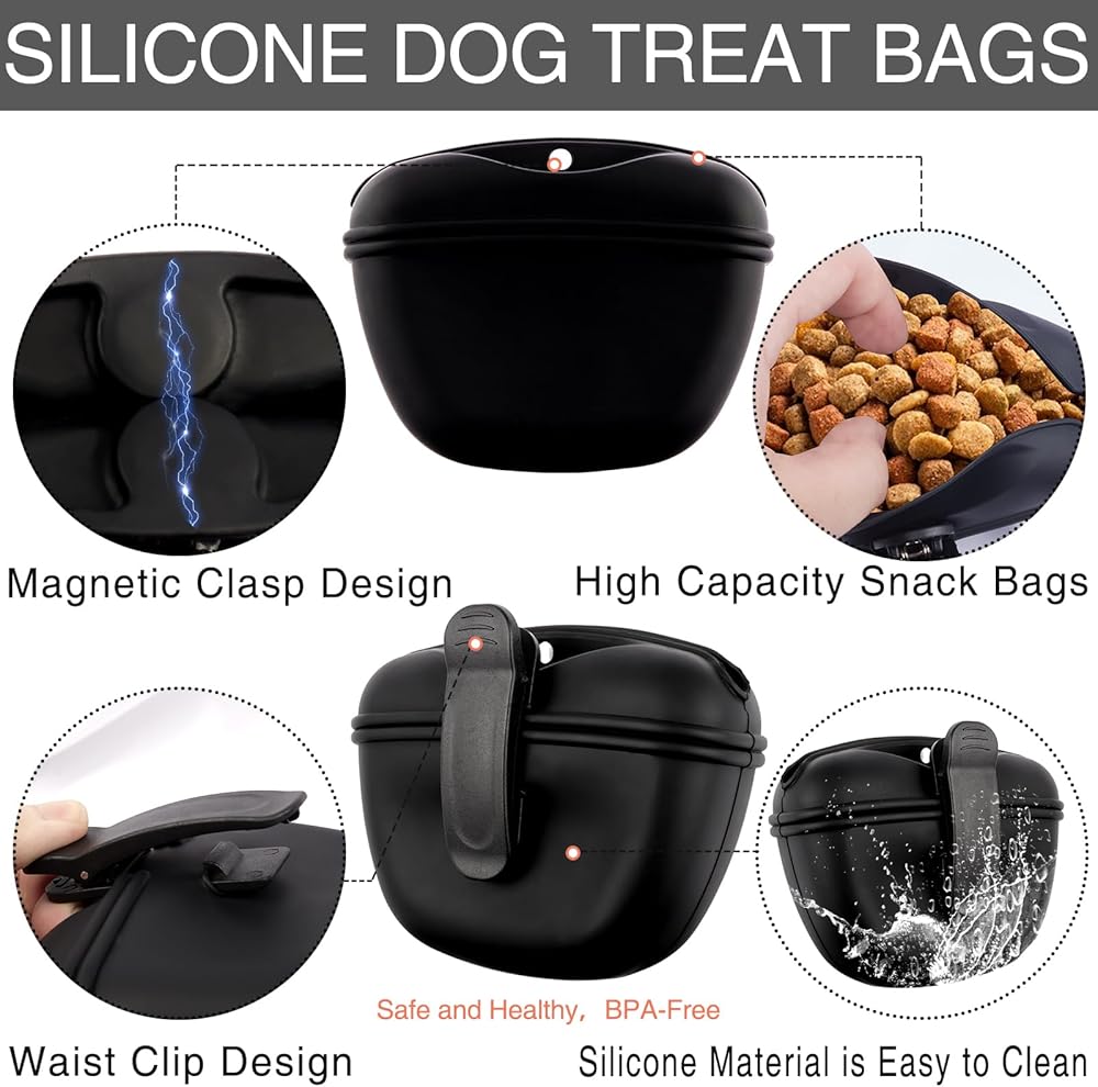 • Magnetic Buckle Treat Bag: The Silicone Dog Treat Bag Adopts a Magnetic Closure Design, and the Large Opening Design Allows Quick Access with One Hand and Automatically Closes After Feeding. The Silicone Material is Easy to Clean and Waterproof. The Treat Bag Comes with a Unique Clip that Can Be Clipped to a Pocket or Belt Loop