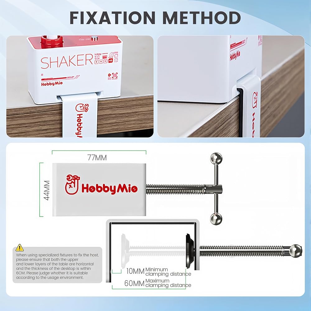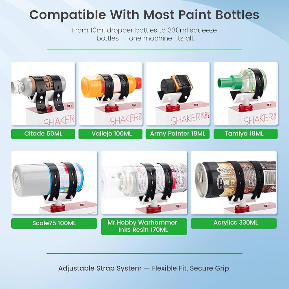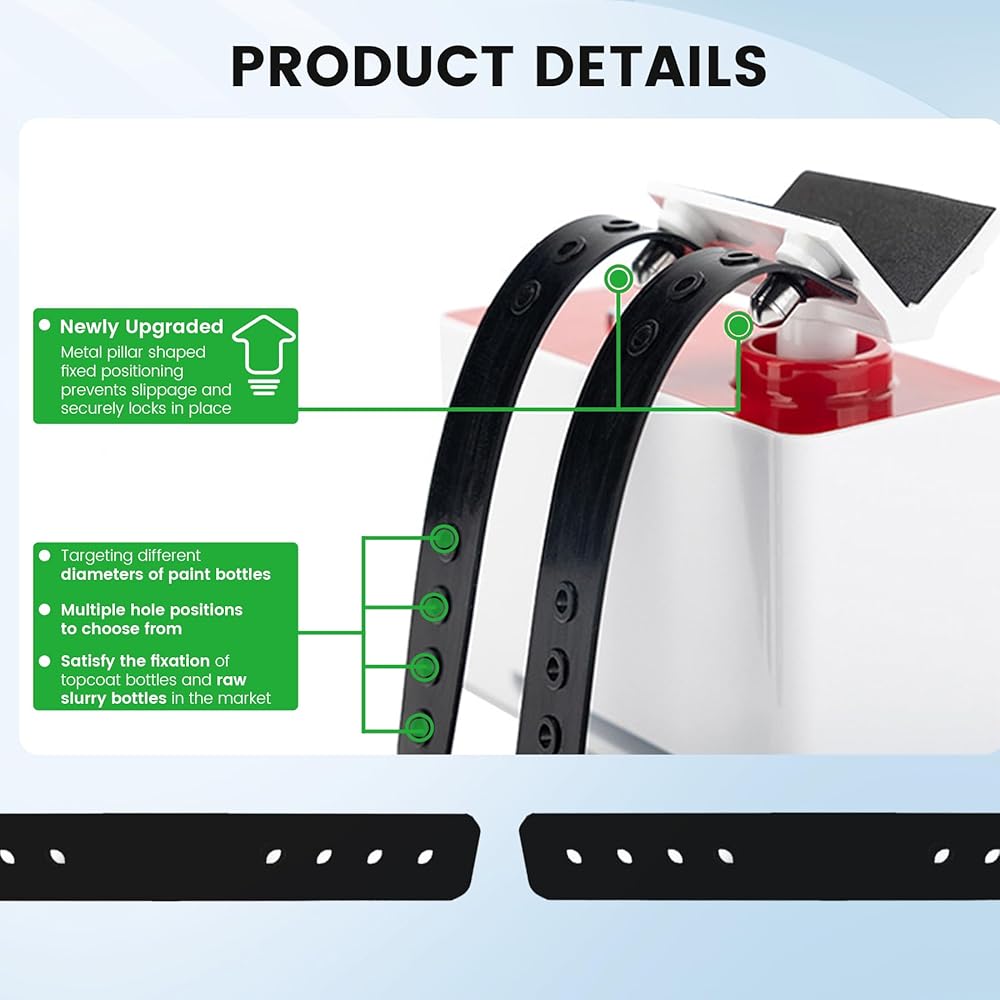 2. 【Universal Bottle Compatibility with Adjustable Straps】L-shaped base and dual rubber straps securely fit most bottle sizes: from small 18–80ml paint bottles to 330ml squeeze bottles. Multi-hole strap design prevents slipping and ensures stable mixing