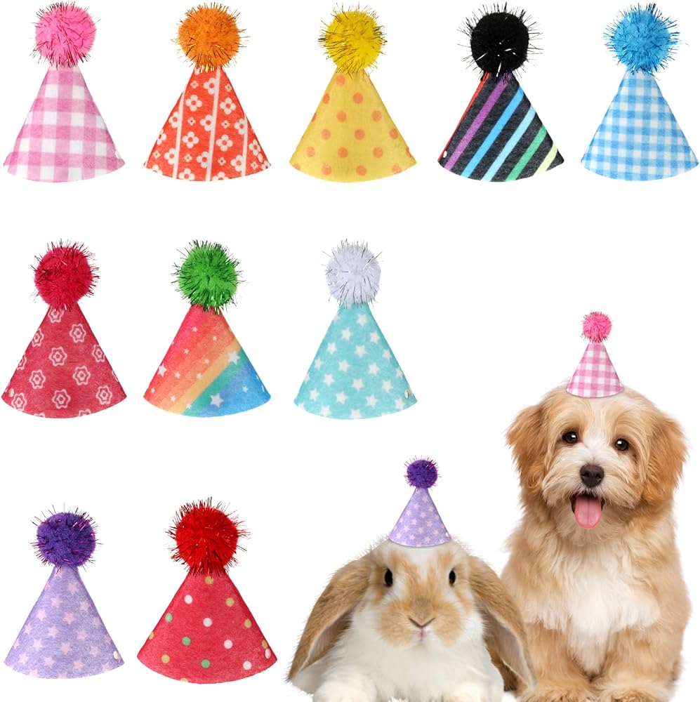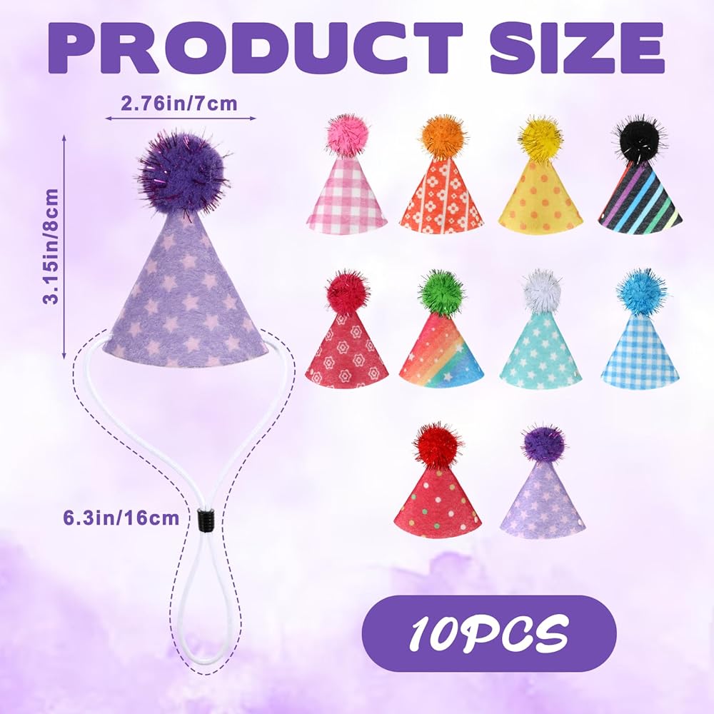 Vibrant and Varied Colors: This collection of hats for cats offers 10 distinct styles in a range of colors like red, blue, and pink. The assortment allows you to match the dog party hat to any outfit or occasion, adding a pop of color and fun to your pet's ensemble.