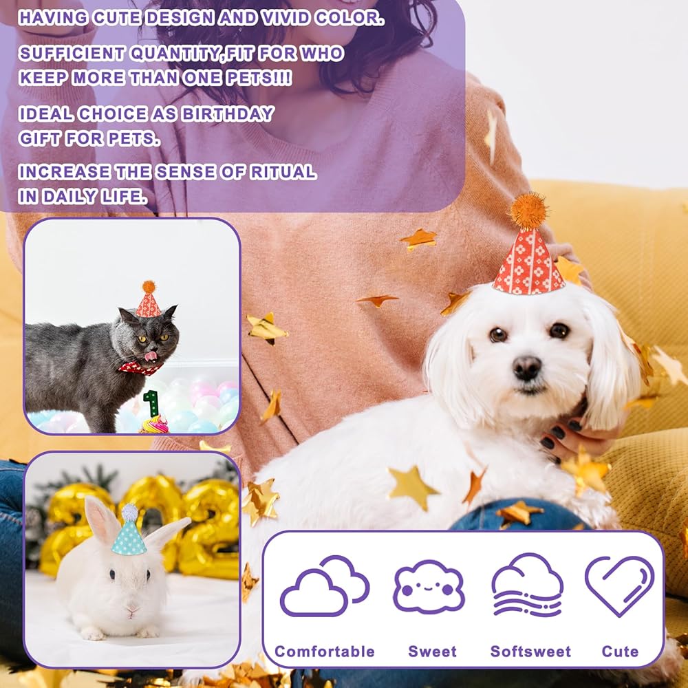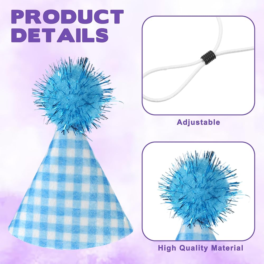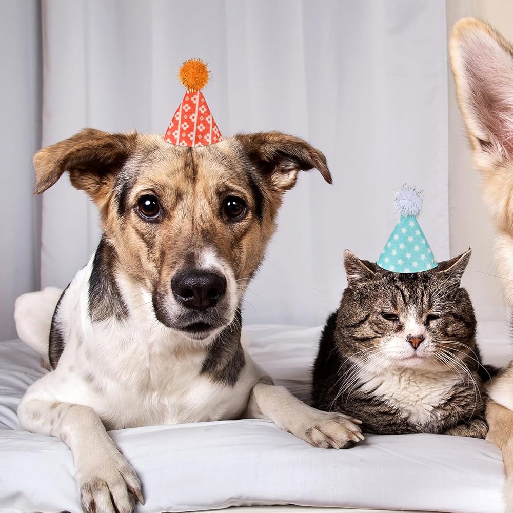 High-Quality, Safe Material: Crafted from premium fabric, Polyester, these dog birthday hats are soft, durable, and safe for your pet. The top adorned with a plush pom-pom of party hats for stuffed animals adds a playful touch without compromising the pet's comfort, making mini party hats perfect for sensitive skin.