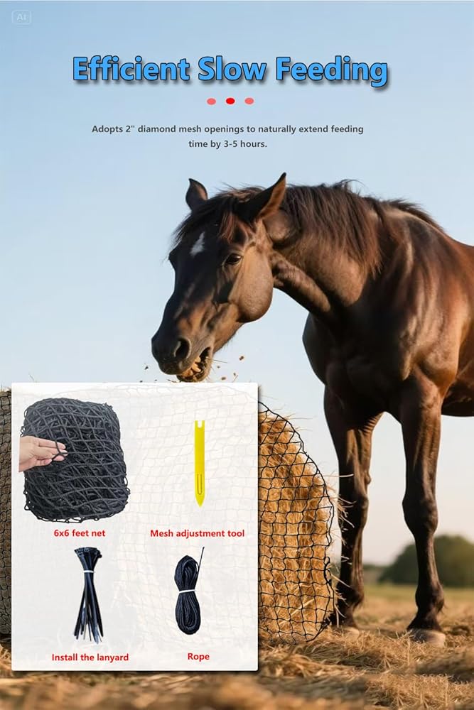 1600 رطل متين وآمن | بوليستر مقاوم للأشعة فوق البنفسجية بسمك 0.2 سم، حواف معززة بسمك 0.25 سم، نسيج 24 غرزة لشبكات القش المستديرة هذه للأحصنة؛ تصميم بدون عقد يمنع التشابك/التآكل، يوصى به الطبيب البيطري