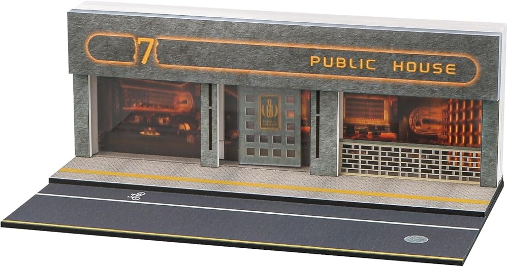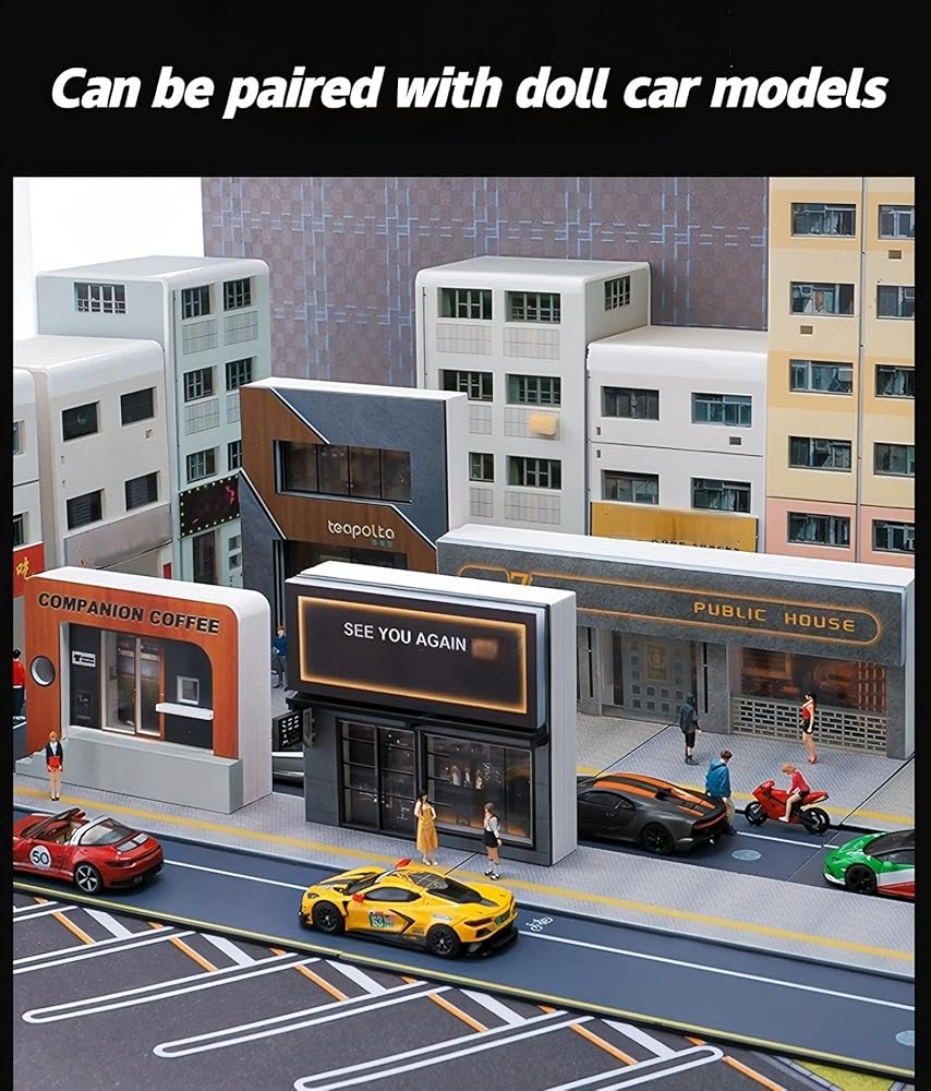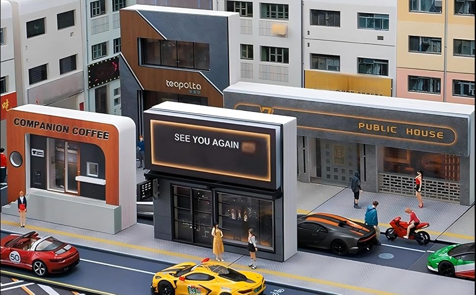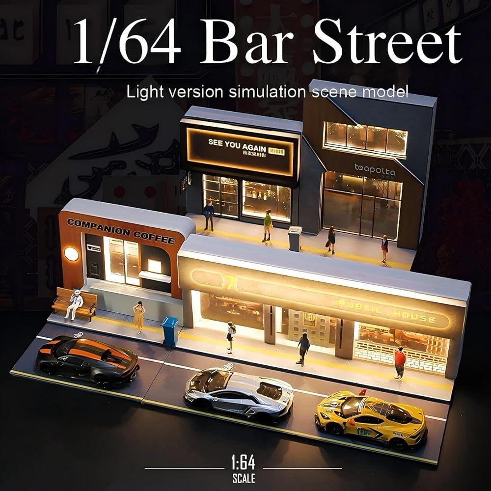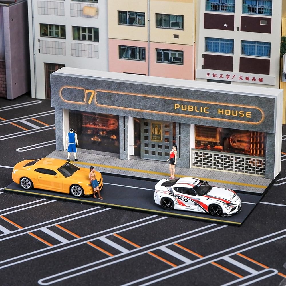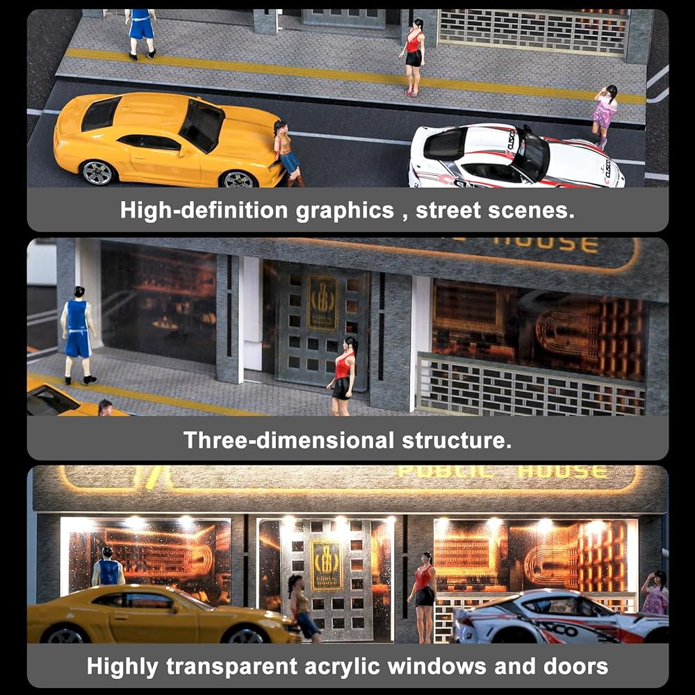 تتميز الديوراما ذات الطبقة الواحدة بتصميم مفتوح نظيف بواجهة حانة غير مرتبة مع عناصر الشارع الأساسية، مع التركيز على سياراتك النموذجية 1:64 (المركبات غير متضمنة).