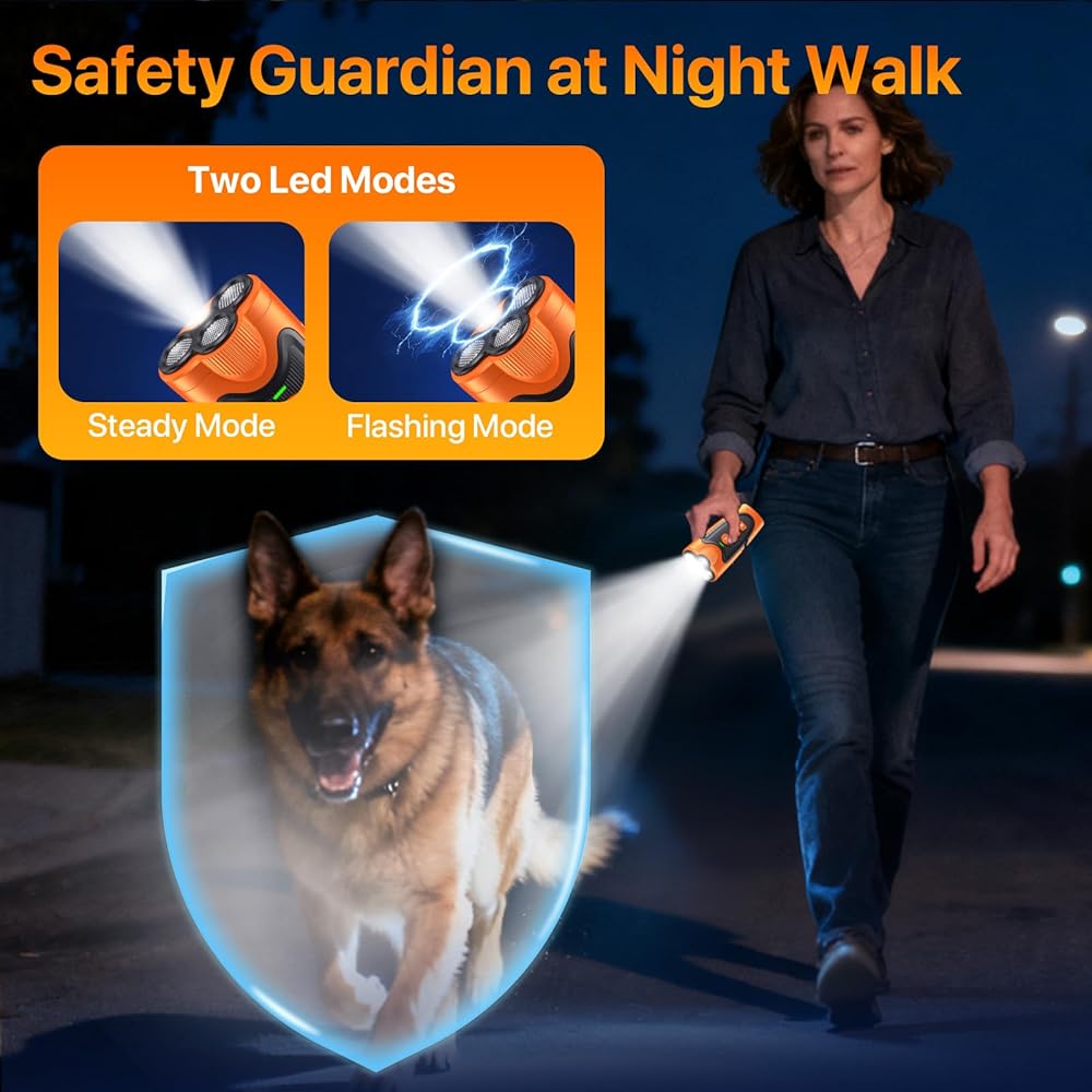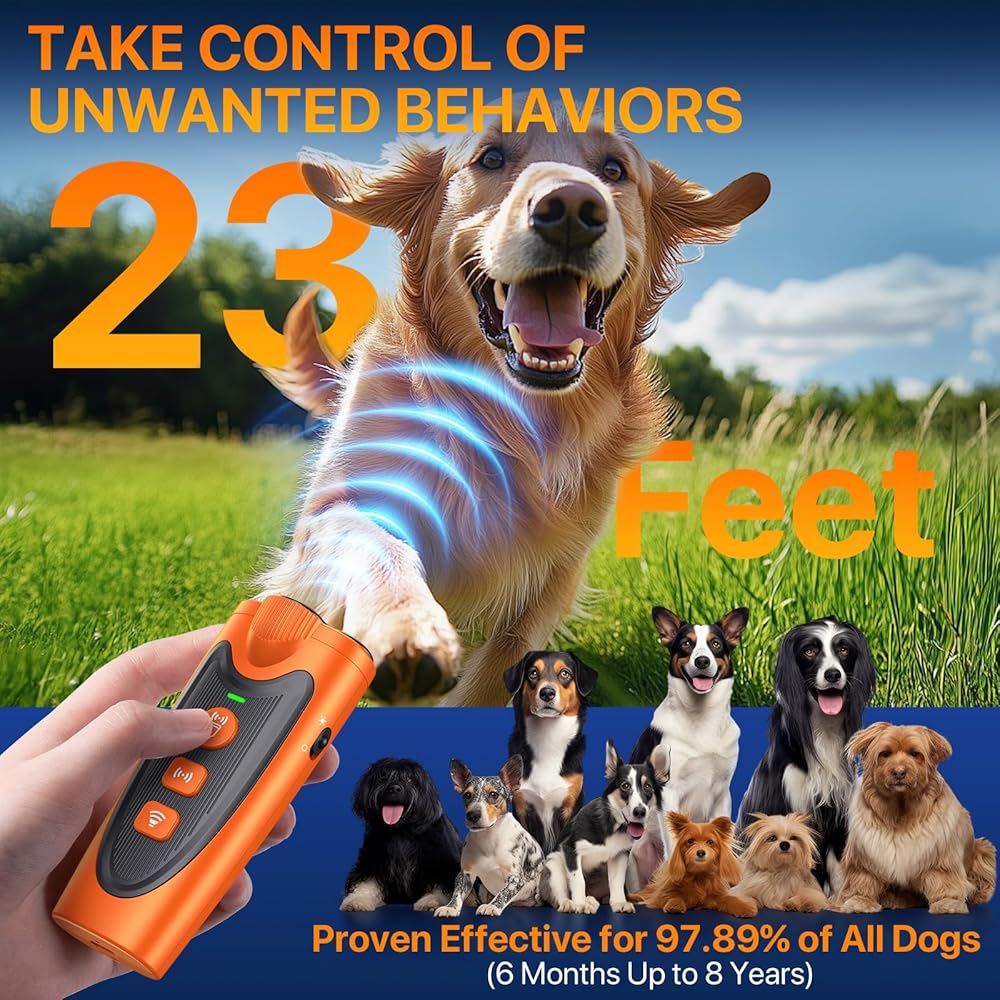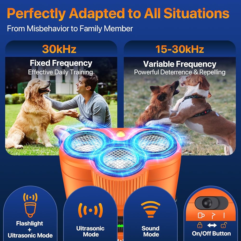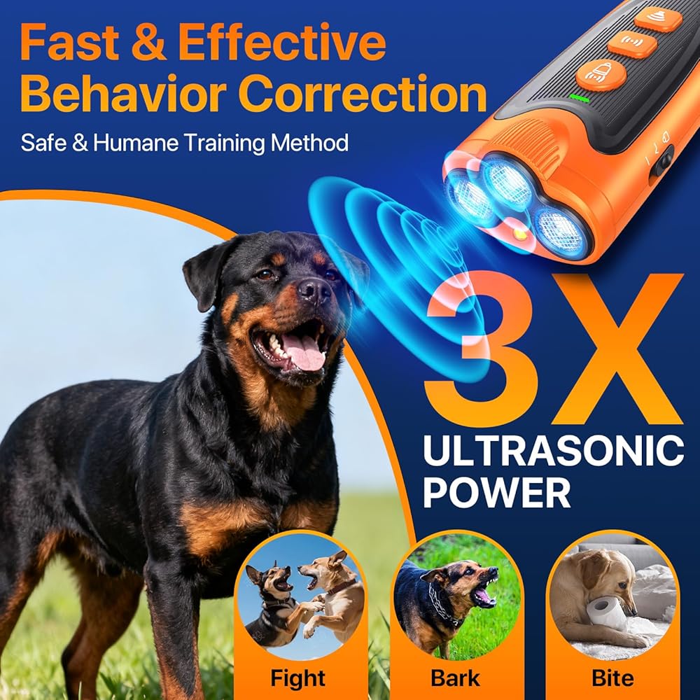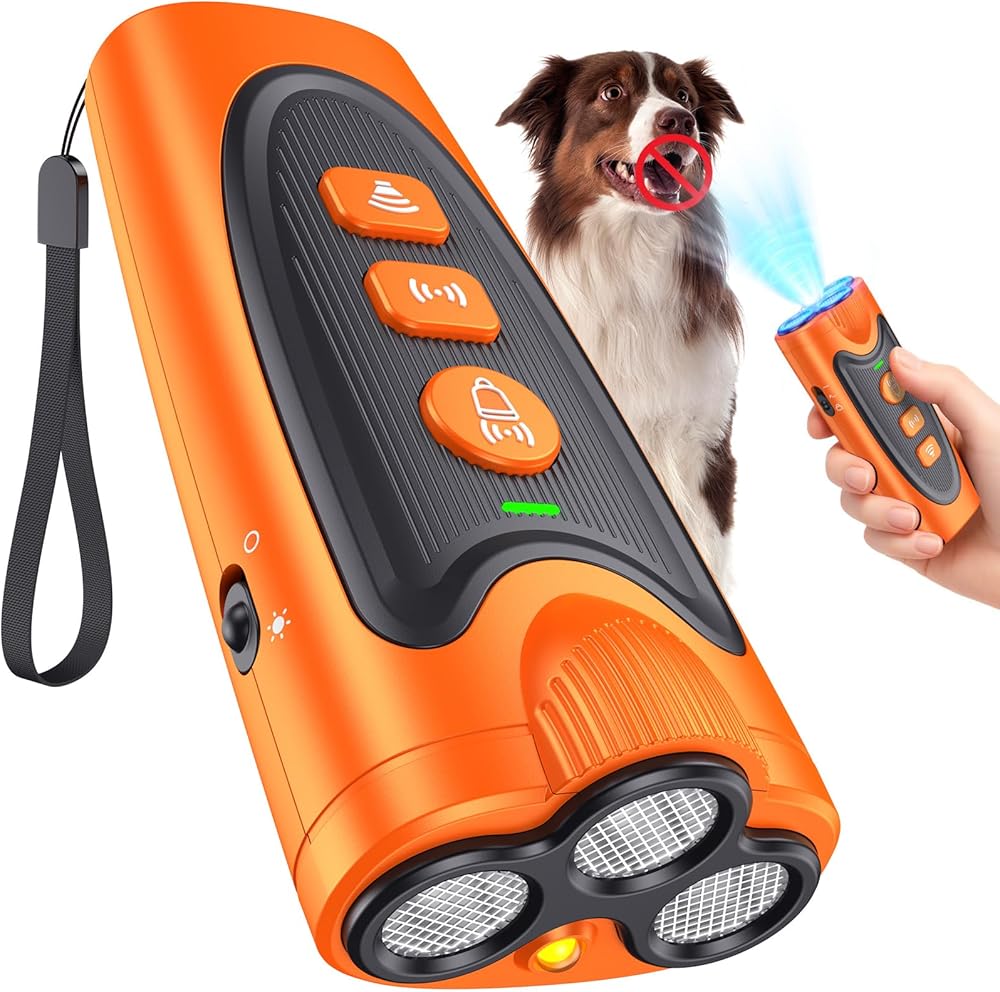 جهاز منع نباح الكلاب، 3X جهاز مضاد للنباح بالموجات فوق الصوتية للكلاب، 6 أوضاع تدريب ونطاق إيقاف نباح الكلاب بطول 23 قدمًا، أداة تدريب محمولة للكلاب مع مصباح يدوي للاستخدام الداخلي والخارجي، برتقالي