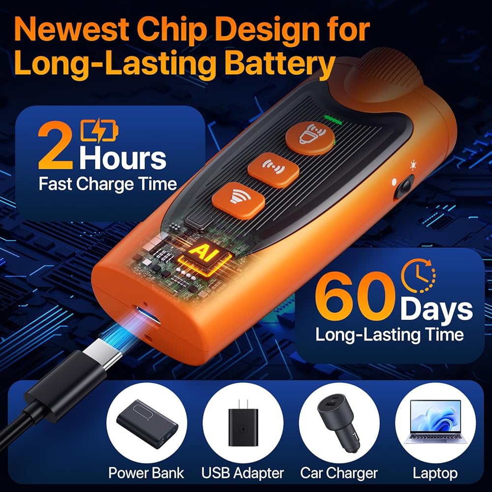 • بطارية تدوم 60 يومًا وشحن سريع - يعمل الشحن الكامل من النوع C لمدة ساعتين على توفير ما يصل إلى 60 يومًا من الاستخدام المنتظم أو 180 يومًا في وضع الاستعداد. يعني عمر البطارية الاستثنائي هذا أن رادع النباح الخاص بك جاهز دائمًا لجلسات التدريب أو حوادث النباح غير المتوقعة، دون متاعب الشحن المستمر.