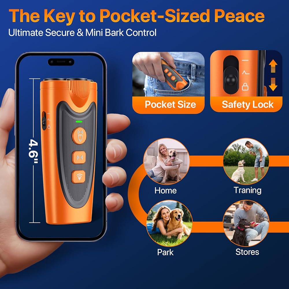 • صغير الحجم للغاية وقابل للحمل - مصمم ليكون أصغر بنسبة 50% من الأجهزة القياسية، ويتناسب بسهولة مع جيبك أو حقيبتك. يضمن تصميمه المحمول إمكانية تشجيع السلوك الجيد والتوقف عن النباح في أي وقت وفي أي مكان، أثناء المشي اليومي أو المغامرات أو في الأماكن العامة.