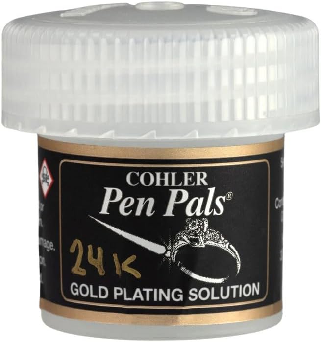 Cohler 24k Gold Pen Plating Solution 1oz. by Krohn Industries This is a 1 ounce bottle of specially formulated pen 14K yellow gold shade plating solution concentrate. This solution is specially formulated for use with pen plating systems that use felt tips. You can use this solution with the disposable pen plating pens with felt tips or with any make of pen plating system that uses felt tip plating pens. This is for professional use only. Be sure to soak fresh felt tips for several minutes before first use. Use a different felt tip for each shade of solution. Be careful not to contaminate felt tips or solution with dirt, grease or grime. Be sure surface to be plated is totally clean.