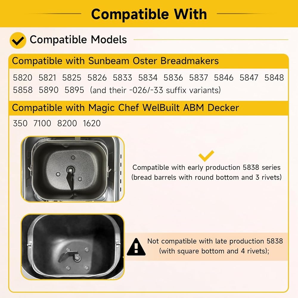 • 【متوافق مع】: متوافق مع صانعي الخبز Sunbeam Oster 5820، 5821، 5825، 5826، 5833، 5834، 5836، 5837، 5846، 5847، 5848، 5858، 5890، 5895 (ولاحقتهم -026/-33) المتغيرات)؛ متوافق مع سلسلة 5838 للإنتاج المبكر (براميل الخبز ذات القاع المستدير و3 مسامير برشام)؛ غير متوافق مع الإنتاج المتأخر 5838 (بقاع مربع و4 مسامير)؛ متوافق مع Magic Chef WelBuilt ABM Decker 350 7100 8200 1620