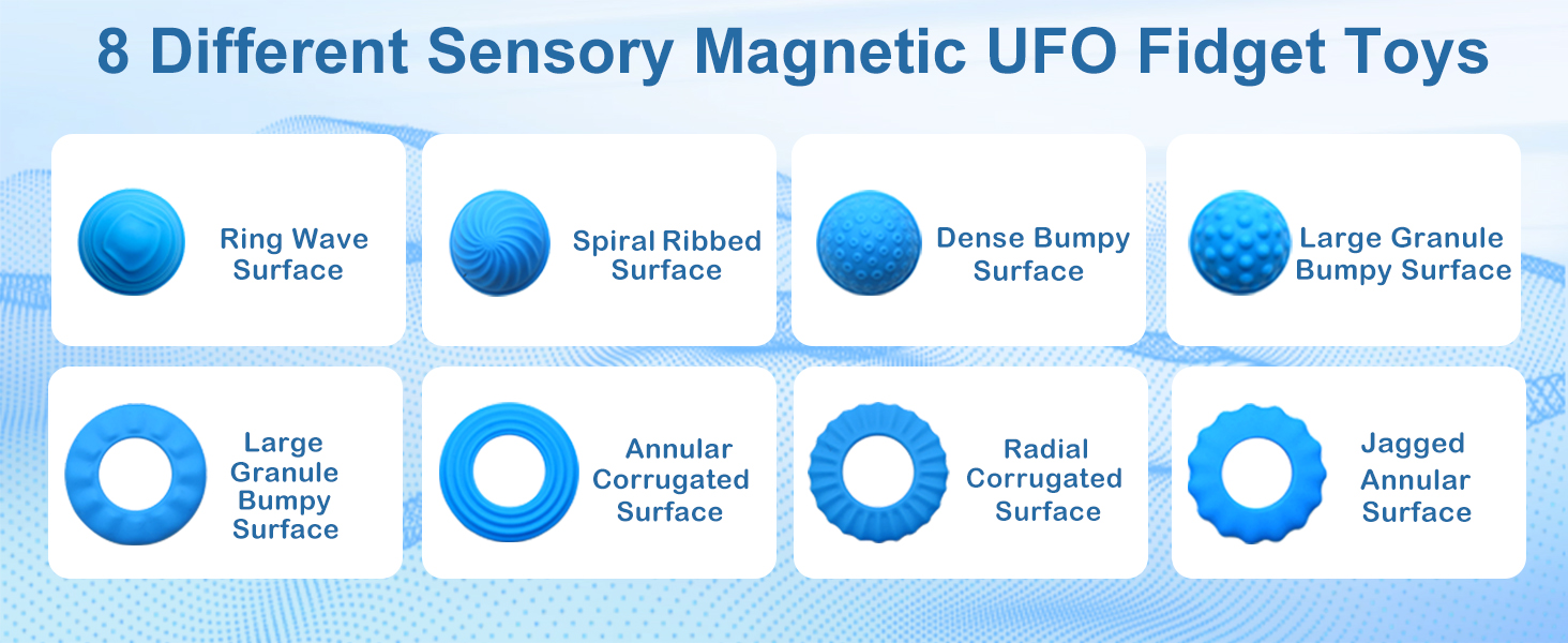 8 وظائف لمسية - 4 أنسجة على الكرات و4 على حلقات التململ. توفر الأنسجة المختلفة تحفيزًا حسيًا، وتلبي الاحتياجات الحسية الخاصة باختيار البشرة. توفر هذه الكرات المغناطيسية المصنوعة من السيليكون الهدوء، وتقلل من القلق/التوتر، وتعزز الإنجاز وتحفز ASMR المهدئ. فعال بشكل خاص لتخفيف التعب العقلي الناتج عن الاستخدام الطويل للهاتف الذكي/الكمبيوتر، بما في ذلك أعراض التوتر والقلق والتهاب المفاصل