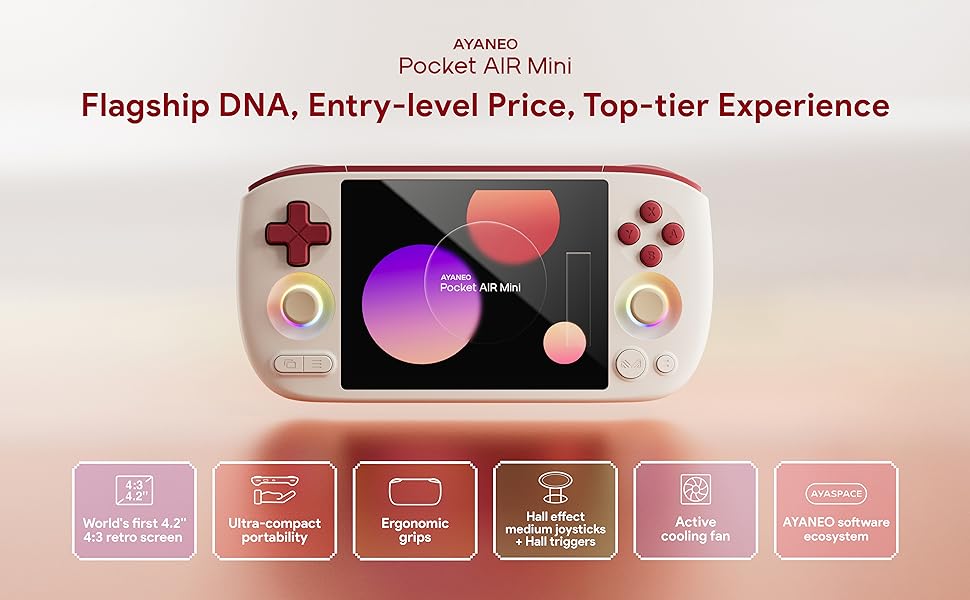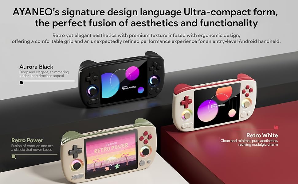 【جهاز محمول صغير الحجم ومحمول بنظام Android 】 استمتع بمزيج مثالي من الحنين إلى الماضي وسهولة الحمل مع جهاز AYANEO Pocket AIR Mini. يتميز بتصميم أنيق وخفيف الوزن وشاشة عالية الدقة مقاس 4.2 بوصة بنسبة 4:3 (1280 × 960)، يوفر هذا الجهاز المحمول القديم تجربة ألعاب كلاسيكية أصيلة يمكنك اصطحابها إلى أي مكان.