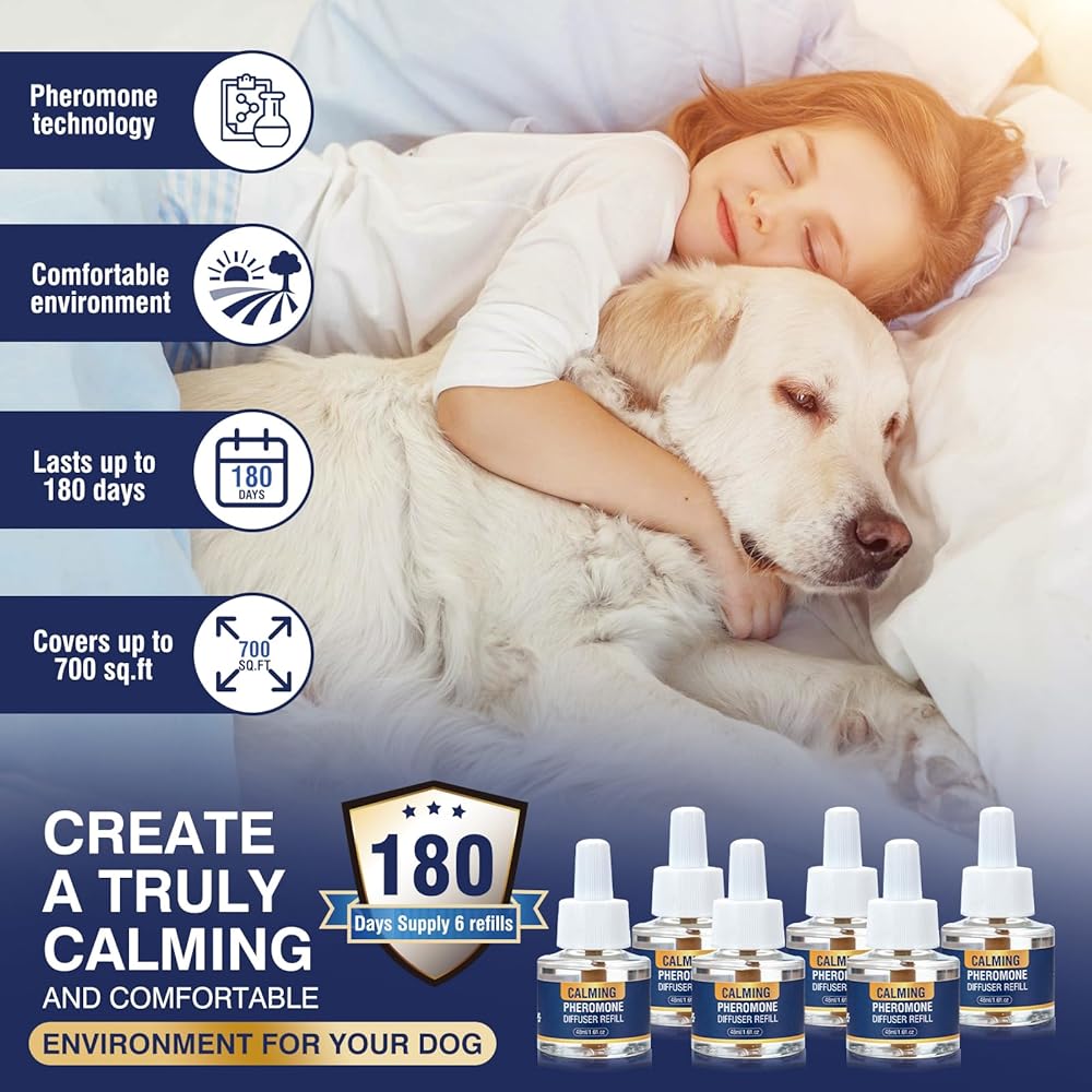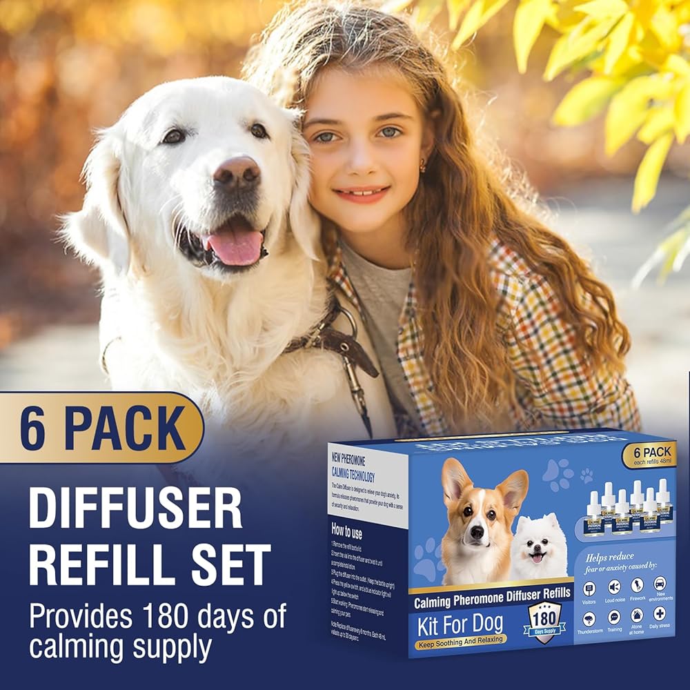 عبوة من 6 عبوات من فرمونات تهدئة الكلاب، عبوة من 6 عبوات من الفيرومونات الخاصة بالحيوانات الأليفة، 48 مل لتهدئة وتخفيف القلق، وتقليل العدوانية، ومكافحة الإجهاد، والنباح، ومناسبة لأجهزة توزيع الروائح الشائعة في 180 يومًا (لا طعم لها)