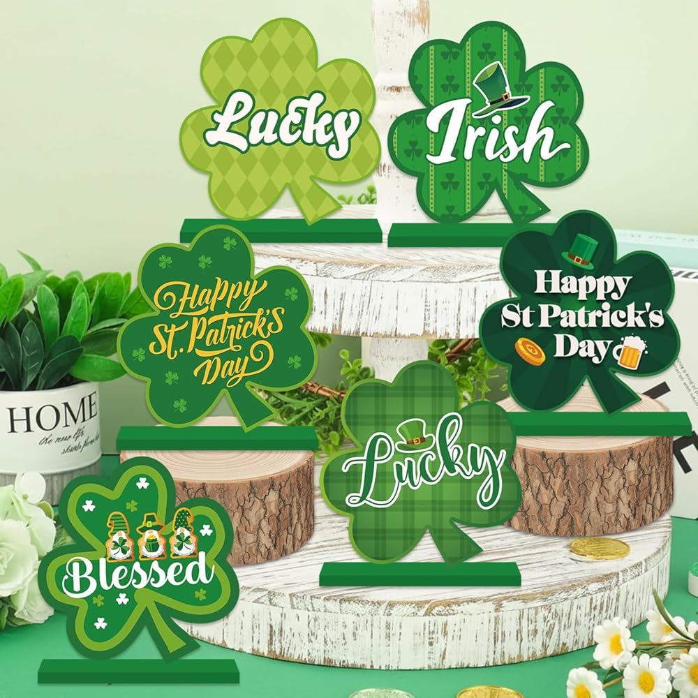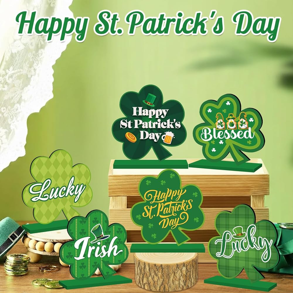 6 قطع ديكورات يوم القديس باتريك للطاولة قطعة مركزية خشبية لتزيين طاولة عيد القديس باتريك السعيد، زخارف شامروك خضراء أيرلندية لسطح الطاولة لحفلة القديس باتريك وديكور المكتب المنزلي