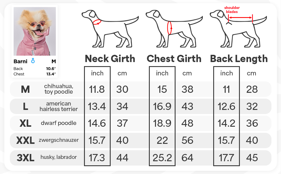 بالنسبة لمعظم سلالات الكلاب - تأتي معاطفنا الشتوية للكلاب بخمسة أحجام (M، L، XL، XXL، 3XL)، مثالية لسلالات الكلاب الصغيرة والمتوسطة والكبيرة. لضمان ملاءمة مريحة، يرجى قياس محيط صدر كلبك وطول ظهره قبل الشراء. تُعد هذه السترة الشتوية للكلاب الصغيرة هدية ممتازة للعطلات، وسيساعدك جدول المقاسات لدينا في العثور على سترة الكلاب المثالية لمغامرات الشتاء. رائعة للكلاب الأنثوية، توفر هذه الملابس الدفء والأناقة.