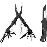 Includes a can opener, #1 Phillip screwdriver, bottle opener, scissors, inch rule, needle nose pliers, bolt gripper, soft wire cutter, straight-edge blade, awl, jewelry driver, hook cutter, corkscrew and foot, mm rule, magnetic bit holder, bevel gauge, and wire crimper.