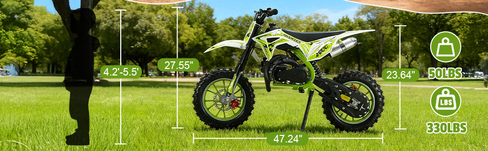 🚀【مثالية للراكبين في مرحلة النمو】بسعة وزن قوية تبلغ 330 رطلاً، تتكيف دراجات الحفرة هذه بسلاسة مع المبتدئين والمحترفين الصغار! يوفر المحرك الصغير والقوي سعة 50 سي سي تسارعًا سلسًا ويمكن التحكم فيه - ليس سريعًا جدًا أو ساحقًا - مما يجعله مثاليًا لتعريف الأطفال بإثارة الركوب على الطرق الوعرة مع تعزيز حب المغامرة مدى الحياة.