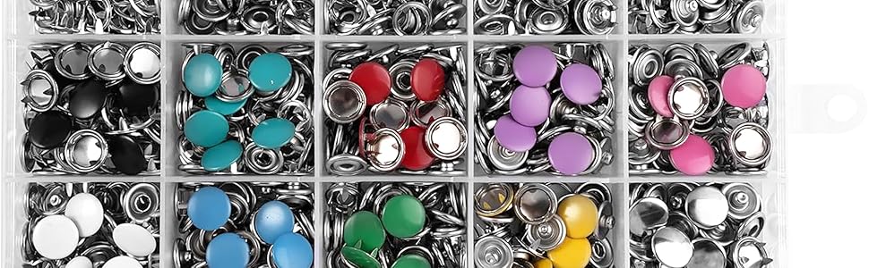 ألوان غنية وكمية وفيرة: تحتوي على 200 مجموعة من الأزرار المعدنية في 10 ألوان، مما يوفر مجموعة واسعة من خيارات الألوان وكمية كافية للحرف اليدوية وصناعة الملابس، تلبي جميع احتياجاتك الإبداعية.