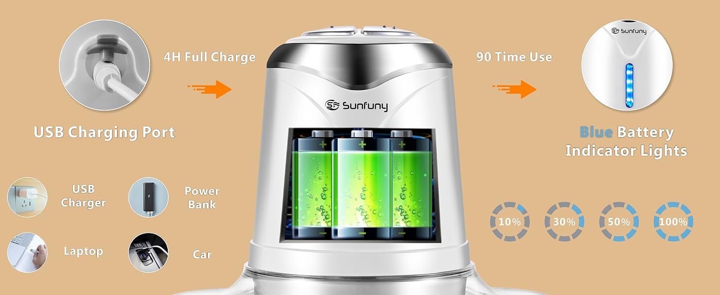 تخلص من القابس المرفق: تحتوي مفرمة الطعام القابلة لإعادة الشحن عبر USB على بطارية مدمجة بقوة 6000 مللي أمبير في الساعة يمكنها إنهاء مهمة التقطيع المستمرة لمدة 30 ثانية حتى 90 مرة بعد الشحن الكامل، وهي رائعة لتناول العشاء في الهواء الطلق وحفلات الشواء في الفناء. يمكنك شحن معالج البطارية اللاسلكي بسهولة باستخدام شاحن USB أو بنك الطاقة أو الكمبيوتر المحمول.