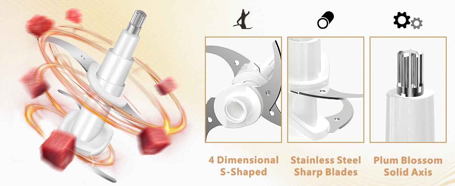 【مزيد من الطاقة للتقطيع بالتساوي】 بالمقارنة مع خلاط المعالج ثلاثي الشفرات، يستخدم معالج الطعام الخاص بنا محركًا أكثر قوة و4 شفرات متقاطعة حادة للمساعدة في تحقيق نتائج أفضل لمعالجة الطعام في وقت أقل. السرعة I لمعالجة الأطعمة اللينة مثل البصل والفلفل الحار والسرعة II لمعالجة الأطعمة الصلبة مثل اللحوم والجزر.