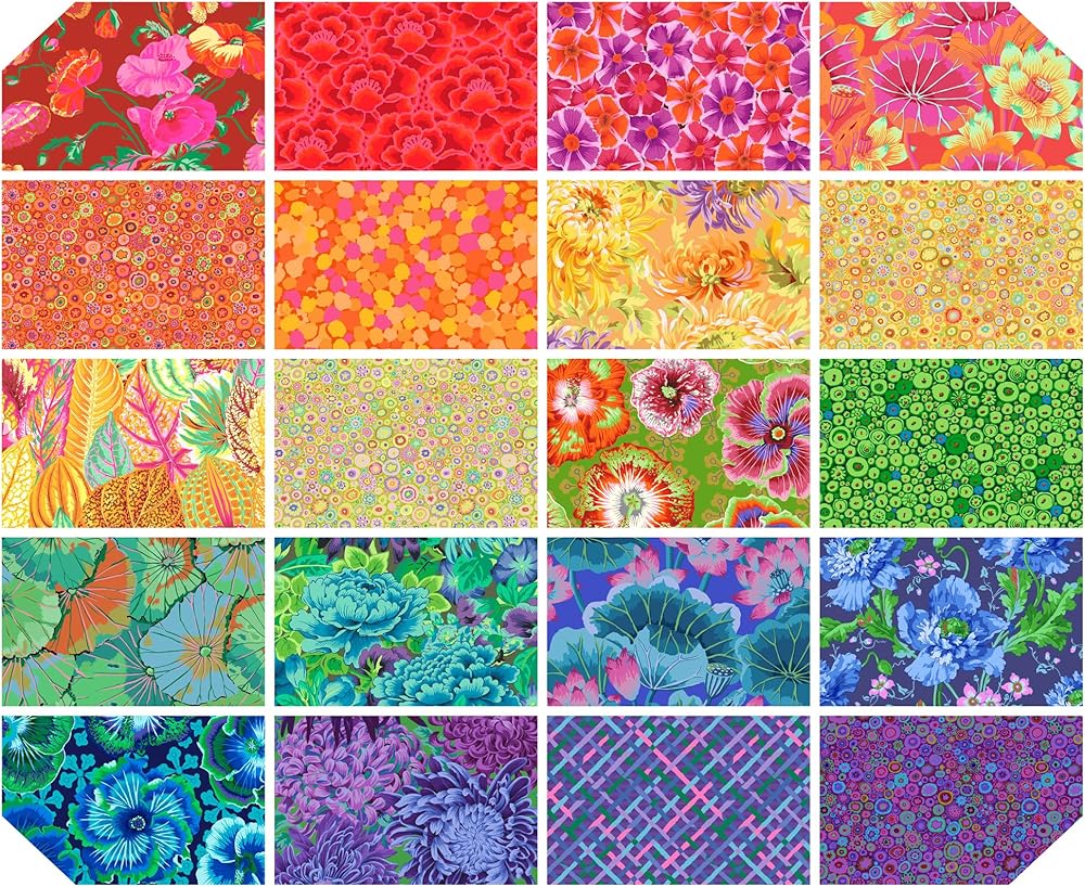 Includes 42 fabric squares (20 different prints) from the Classics Plus Spectrum collection by Kaffe Fassett Collective for FreeSpirit.