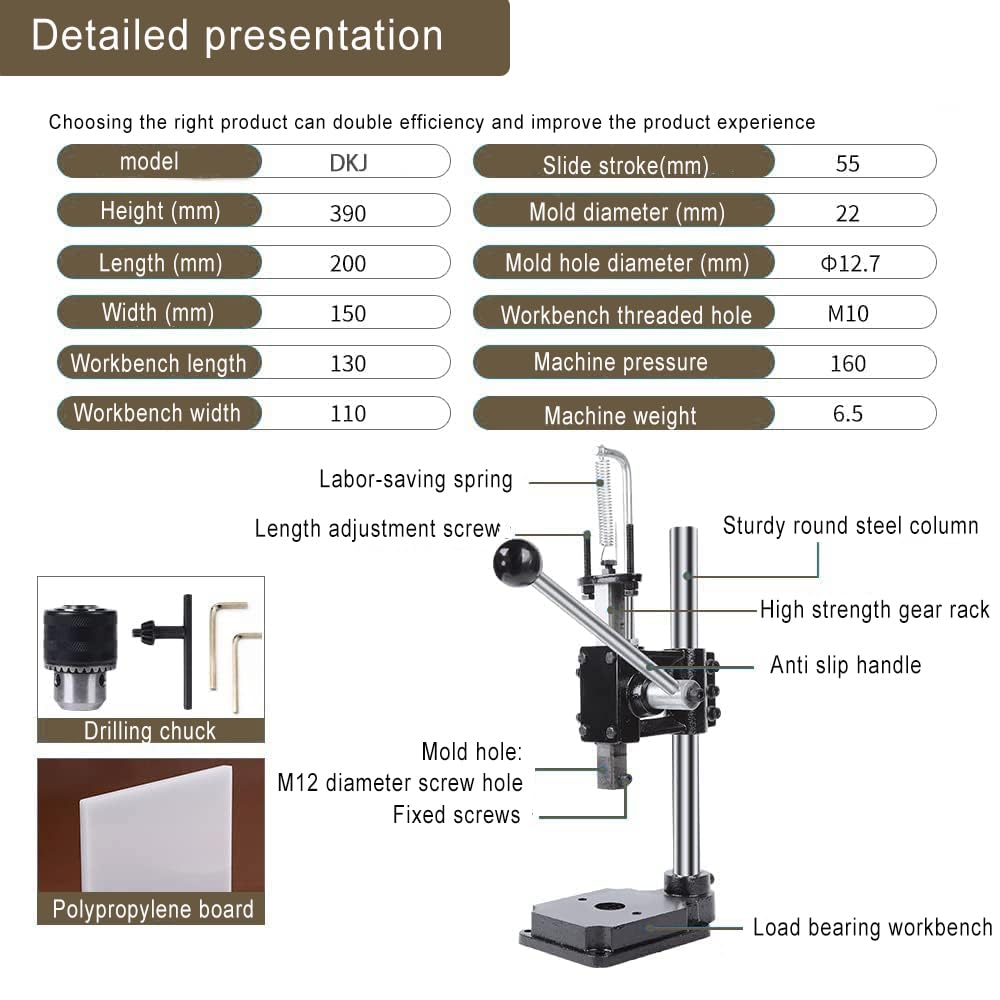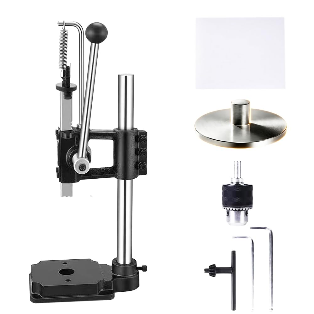 Parameter: Operating height adjustment range: up to 8.3 inches (21 cm) (max when mounting drill clamps) Drill mounting hole: 0.4 inch (11 mm) diameter (M type 12) Drill Clamp Range: 0.06 - 0.5 inches (1.5 - 13 mm). Maximum Pressure: 350.7 lbs (160 kg). Product Weight: 13.3 lbs (6 kg). Silent effect: It can also be used to silent shots work. You can drill the holes silently without using a hammer and drill holes in your side or in time while your child rests at night. Enjoy your hobby of leather crafting work. Energy-saving and improved work efficiency: The right handle has a long and energy-saving handle that allows even people with small forces to operate it easily, and you won't feel tired even after working for a long time. Increases productivity Max press pressure: 160kg PRETTY HOLES - Allows you to drill holes vertically so you can drill clean holes without drilling. Special overlapping leather opening has the advantage of preventing the front and back from shifting. Scope of application: 1.5-13 mm drill chuck allows you to easily attach both round and flat diamonds It can be used for multiple purposes such as rhombus crest, hole, rivet and engraving. Once the drill is removed, you can press down the marks, etc.