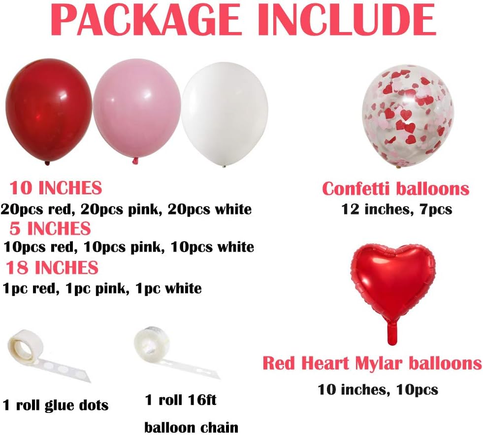 قوس بالونات حفلات عيد الحب باللون الأحمر والوردي والأبيض، 110 قطعة من بالونات عيد الحب مقاس 45.72 سم و30.48 سم و5 بوصات، بالونات على شكل قلب أحمر للفتيات في عيد الميلاد الأول والثاني والثالث والسادس عشر والثامن عشر والواحد والعشرين والثلاثين من حفل الزفاف