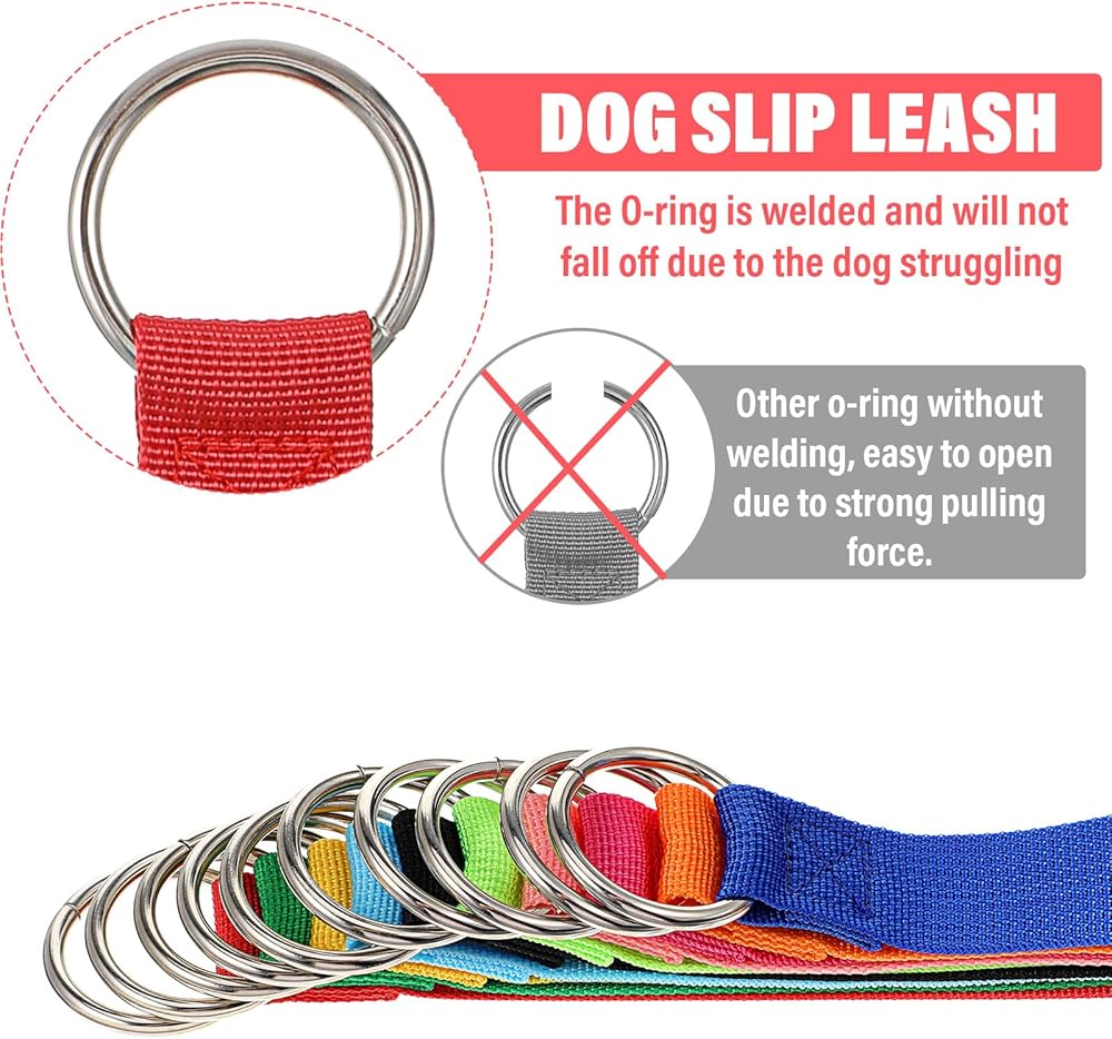 • Easy to Use: The slip leash for dogs is simple and easy to use. Just insert the rope into the metal ring and wrap it around your pet's neck. The metal O-ring of the slip leash can withstand the fierce fighting of dogs and is not easy to deform or wear
