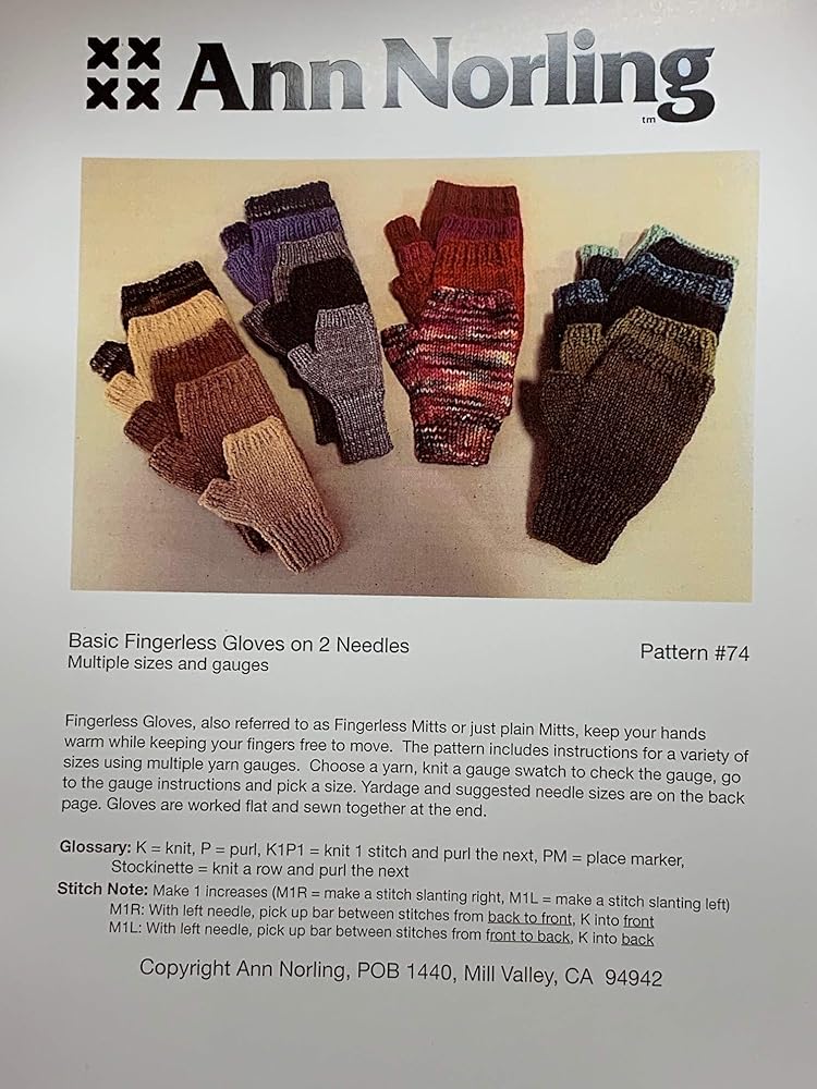 Ann Norling #74 Basic Fingerless Gloves on 2 needles with multiple sizes and gauges.
