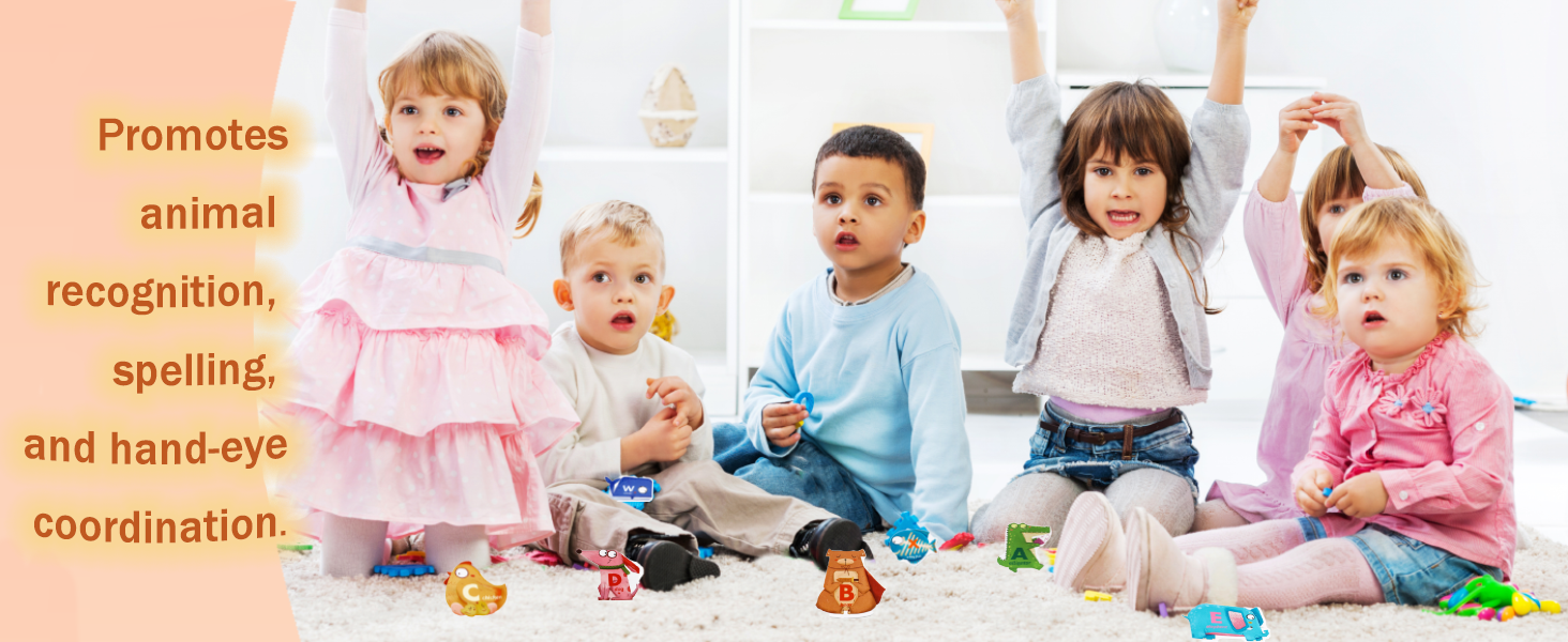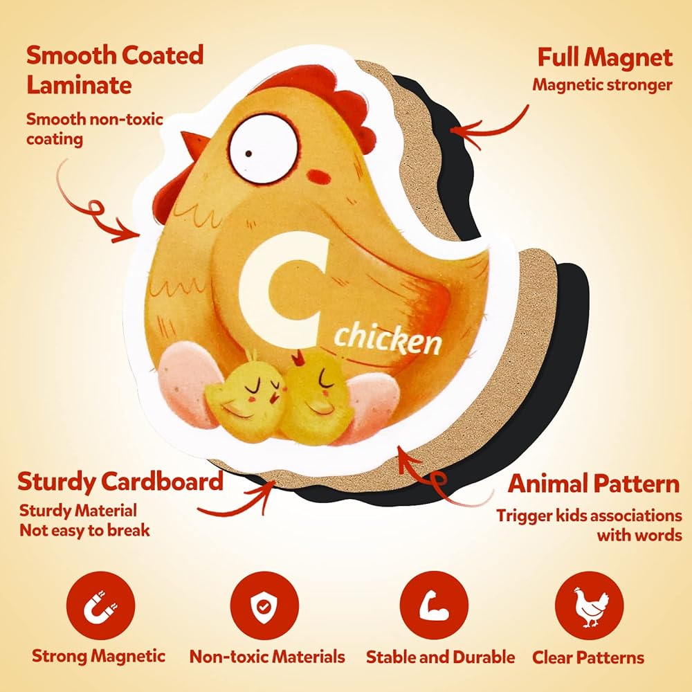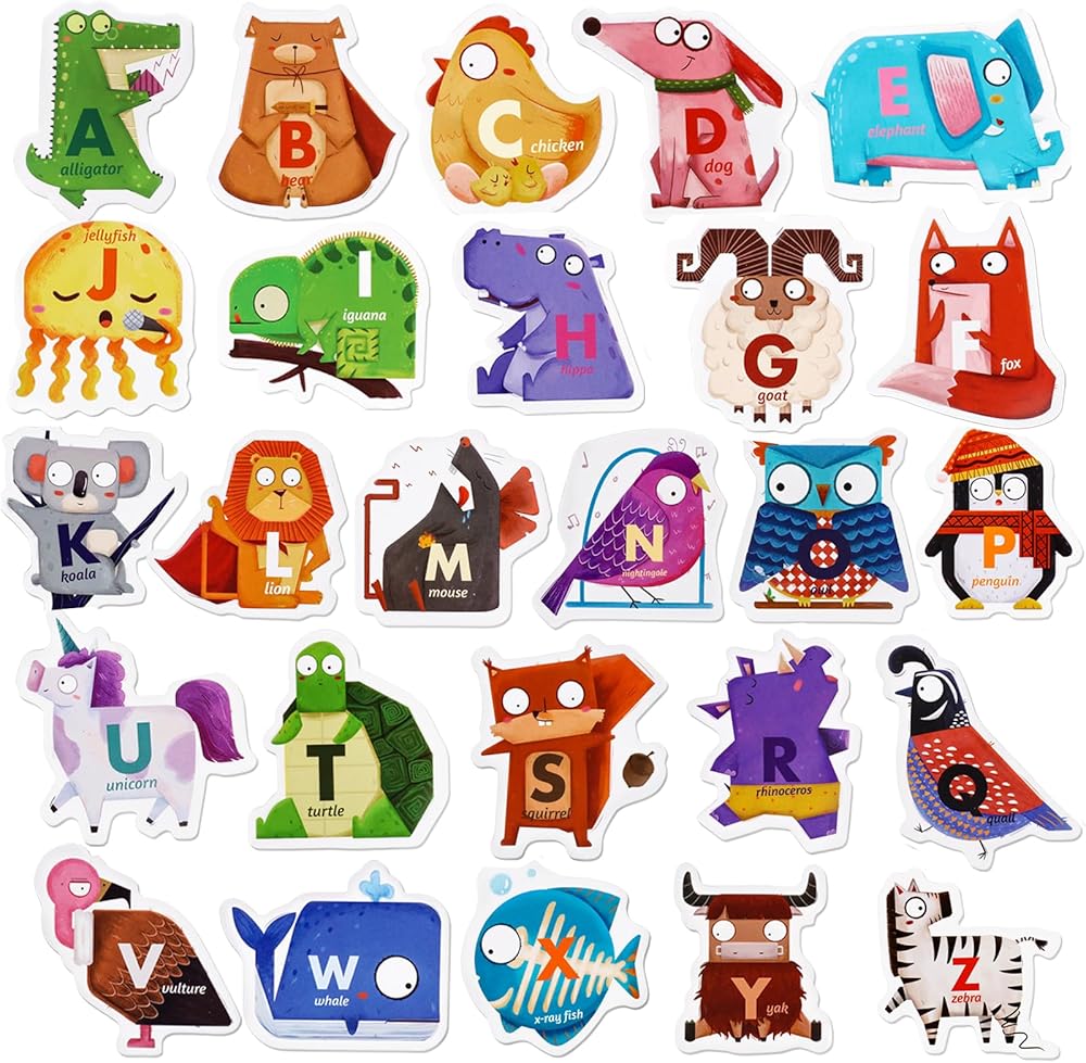 تصميم الحروف الأبجدية الحيوانية بنسخة Q: تتضمن هذه المجموعة 26 حرفًا مغناطيسيًا للحيوانات، يمثل كل منها حرفًا أوليًا كبيرًا مقترنًا بحيوان مناظر (على سبيل المثال، A للتمساح، وE للفيل). تتميز الألعاب بألوان زاهية وأشكال متنوعة، مما يثير فضول الأطفال ويشجعهم على الاستكشاف النشط. من خلال المطابقة المرحة، يبني الأطفال الصغار روابط بين الحروف والحيوانات ويعززون التطور الإدراكي
