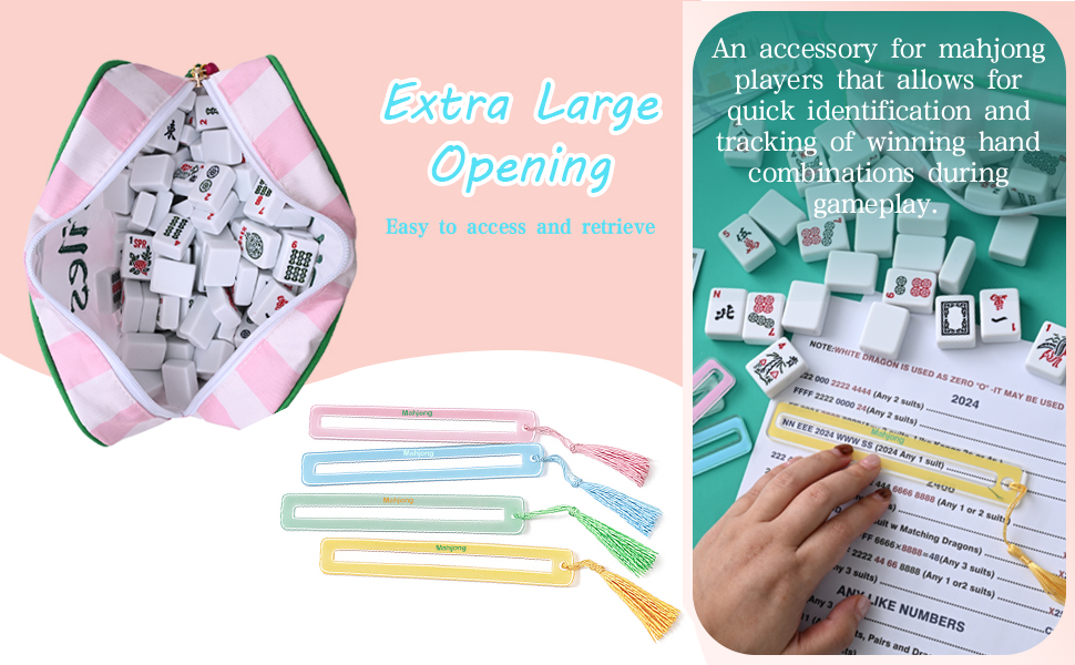 مواد عالية الجودة: حقائب ماجونغ الخاصة بنا مصنوعة من قماش متين، مما يضمن المتانة والحمل؛ تم تصنيع قارئ بطاقات Tassel mahjong finder من الأكريليك مع طباعة واضحة، مما يحافظ على مظهره الأصلي عبر العديد من الاستخدامات، وهذا يسمح لك بالاستمتاع باللعبة دون انقطاع.