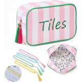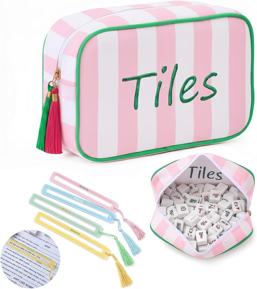 حقيبة بلاط ماجونج فارغة مع 4 قطع من بطاقات مكتشف خط ماجونج أكريليك، وحقائب بلاط ماجونج مع سحاب لملحقات تجمعات السفر وحفلات الألعاب 9.4 × 6.1 × 3.1 بوصة (وردي)