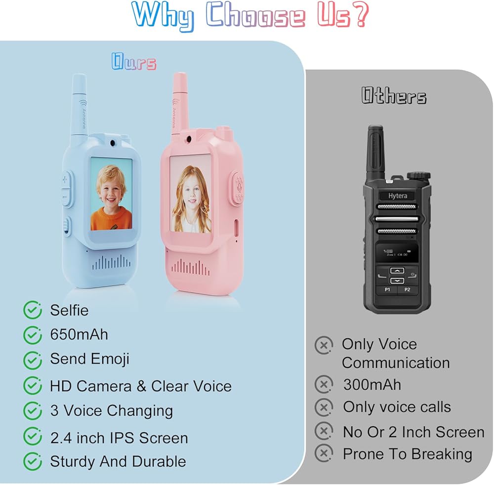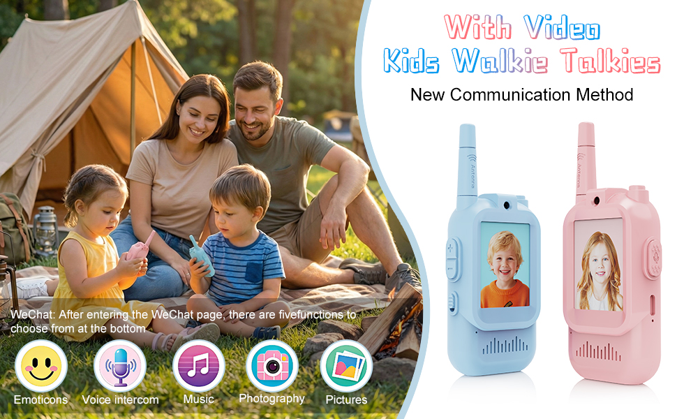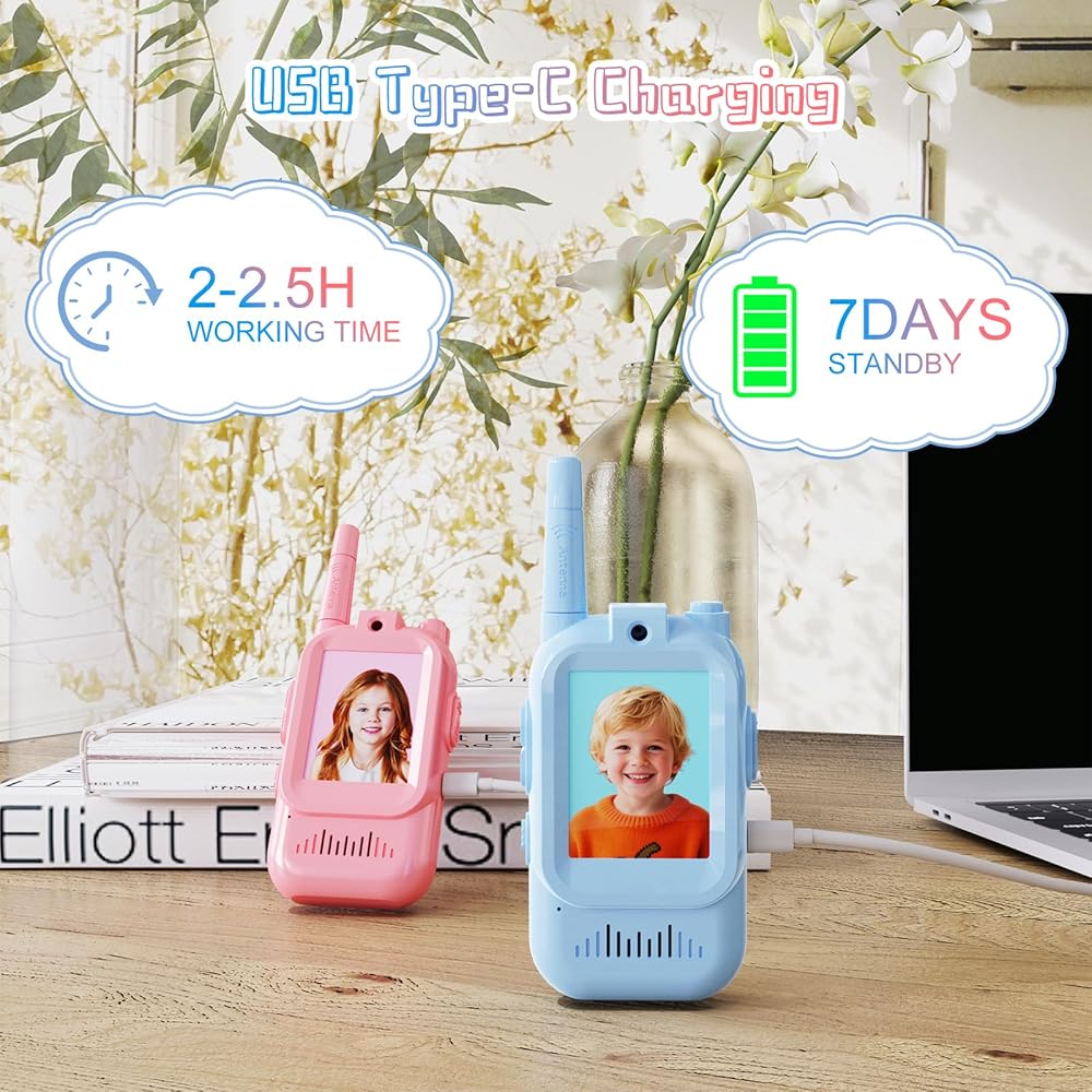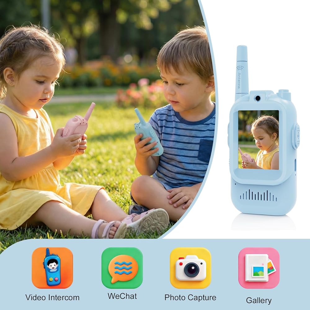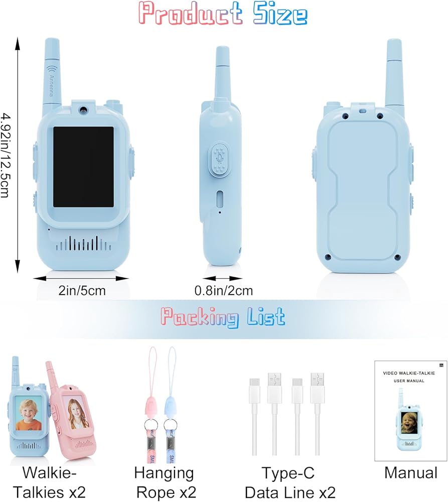 جهاز اتصال فيديو لاسلكي مطور للأطفال: على عكس أجهزة الاتصال اللاسلكي التقليدية التي تنقل الصوت فقط، يتميز هذا الطراز بمكالمات فيديو مدمجة بالإضافة إلى وظائف الدردشة الصغيرة والصور الذاتية. دع الصغار يرون ويتحدثون مع بعضهم البعض في أي وقت وفي أي مكان. تضمن الكاميرا والميكروفون المدمجان عالي الدقة الحصول على مرئيات وصوت فائق الوضوح، مما يجعلها مثالية للمغامرات الخارجية أو رحلات التخييم أو نزهات الحديقة