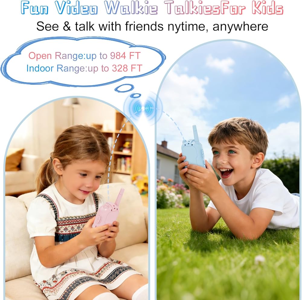 أجهزة اتصال فيديو لاسلكية للأطفال، عبوتان من ألعاب الأطفال الصغار القابلة لإعادة الشحن مع كاميرا عالية الدقة، ألعاب داخلية وخارجية للألعاب العائلية، والخارج، والتخييم، والمشي لمسافات طويلة للأولاد والبنات من سن 3 إلى 12 عامًا (أزرق/وردي)