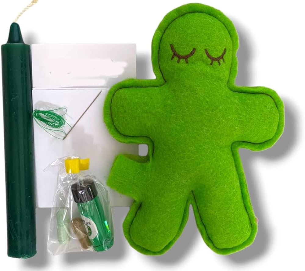 Voodoo Doll / Green Poppets are used in money magic to attract wealth, financial prosperity, and abundance. They symbolize the fertile energy of growth and are often employed in rituals and spells to manifest financial success, increase income, or secure financial stability. Use them to pray for yourself or on behalf of a loved one. Kit contains: A poppet, herbs & powders, a scrap of parchment, 1 dram of perfume, 1 candle, 1 threaded needle, & instructions. Prayer for Fast Money Green Poppet: "Green Poppet of prosperity, I call to thee, Bring forth abundance, let wealth flow free. Open paths of fortune, clear and bright, Grant success and financial might. In your fibers, magic weave, In my life, prosperity achieve."