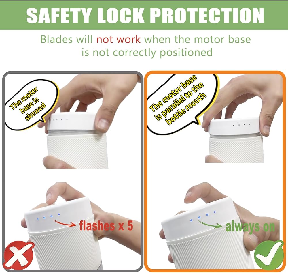 【𝗘𝗮𝘀𝘆 𝘁𝗼 𝗢𝗽𝗲𝗿𝗮𝘁𝗲】: تحتاج العصارة الصغيرة فقط إلى النقر المزدوج على الزر، وبعد 30 ثانية، يمكنك صنع مشروب سلس. إذا وجدت أن الشفرة لا تعمل عندما تكون الطاقة كافية، فهي آلية حماية، فقط قم بإعادة إحكام قاعدة المحرك وتشغيله، فقفل الأمان الخاص بإبريق الخلاط المحمول يضع سلامتك دائمًا في المقام الأول.