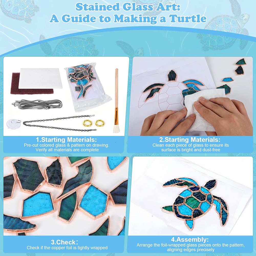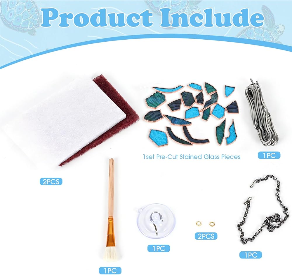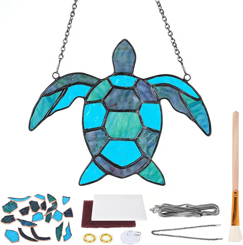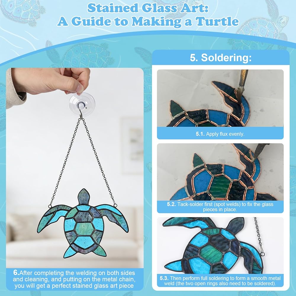 DIY Stained Glass Kit: This turtle-themed DIY stained glass kit includes all tools and materials needed to create a beautiful light-catching ornament: 20pcs pre-cut pieces of blue/green/navy glass, 1 roll of solder wire, pattern template, brush, polishing pad, hanging chain, suction cup, and 2 jump rings. Eliminate the hassle of sourcing individual supplies—even beginners can effortlessly create stunning stained glass pieces