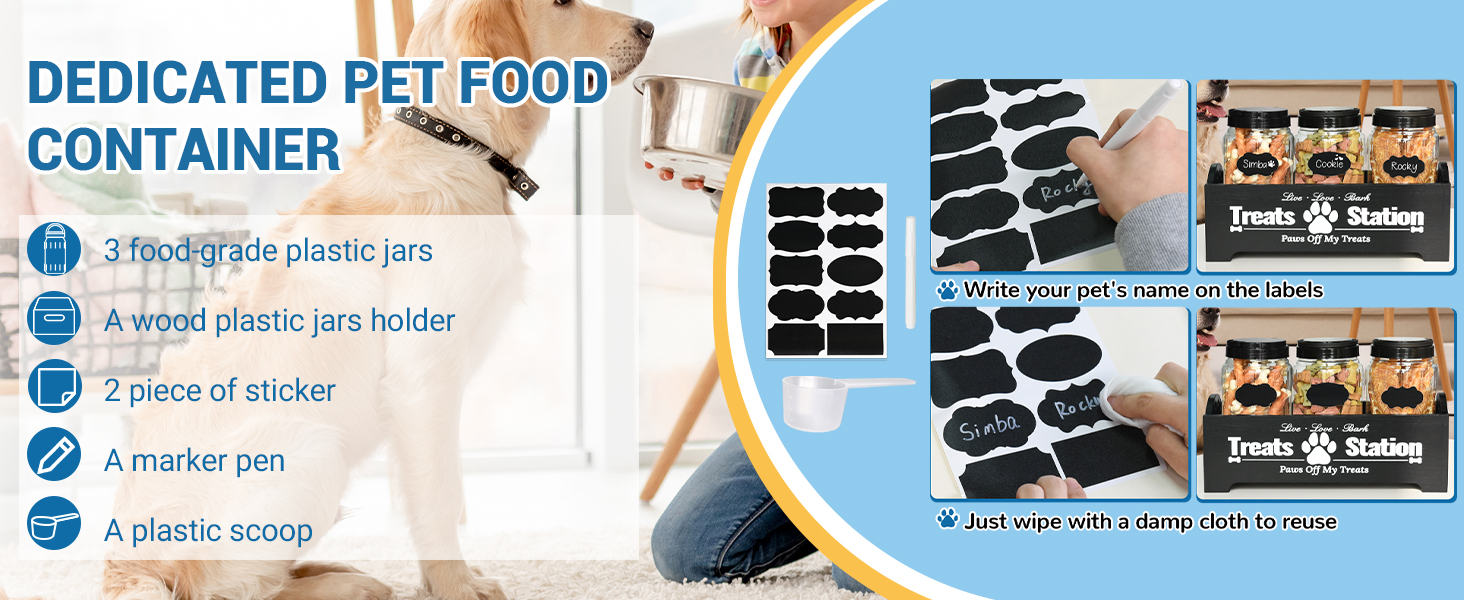 • 【مواد آمنة وسهلة التنظيف】نحن ندرك أهمية الحفاظ على طعام الحيوانات الأليفة آمنًا، وهذا هو السبب في أن منظم تخزين طعام الحيوانات الأليفة الخاص بنا مصنوع من مواد صالحة للطعام. يمكن لجرة البسكويت البلاستيكية للكلاب أن تمنع الكلاب أو القطط من كسر البرطمانات بمخالبها الفضولية، مما يضمن سلامة حيواناتك الأليفة. إن تخزين مكافآت الكلاب اللطيفة مصنوع من الخشب الصلب الصديق للبيئة، وهو متين ولا يتشوه بسهولة. حاوية علاج الحيوانات الأليفة سهلة التنظيف، فقط قم بغسلها بقطعة قماش مبللة، وستكون جاهزة للاستخدام مرة أخرى