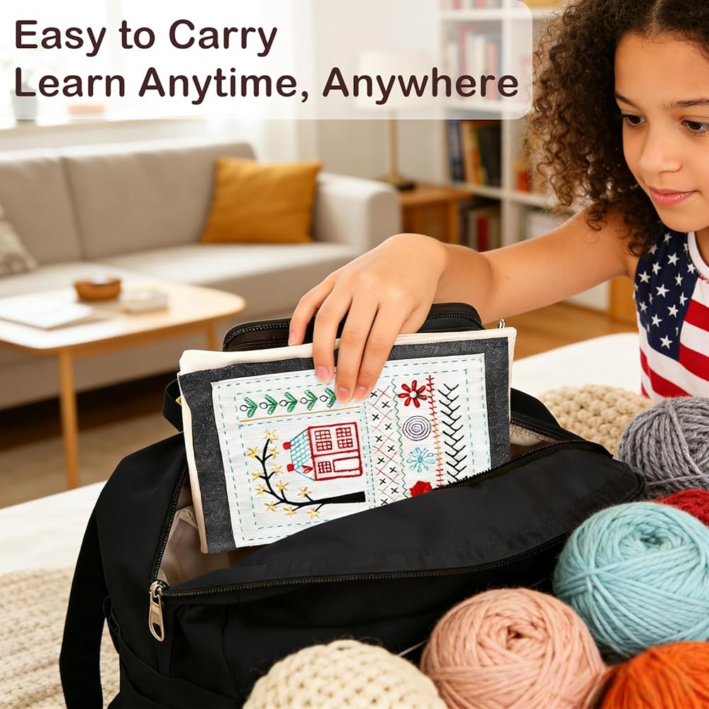 محمول وممتاز: كتاب غرز Embroom مصنوع من قماش الكتان بتصميم على شكل كتاب، ويمكن طيه بشكل مسطح ليناسب بسهولة حقائب الظهر أو حقائب اليد من أجل سفر خالٍ من المتاعب. كل صفحة متينة ومقاومة للتمزق، ومصممة للتمرين المتكرر.