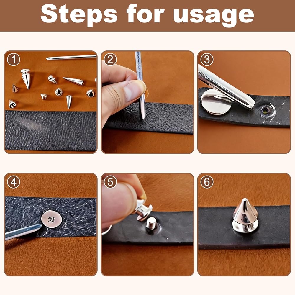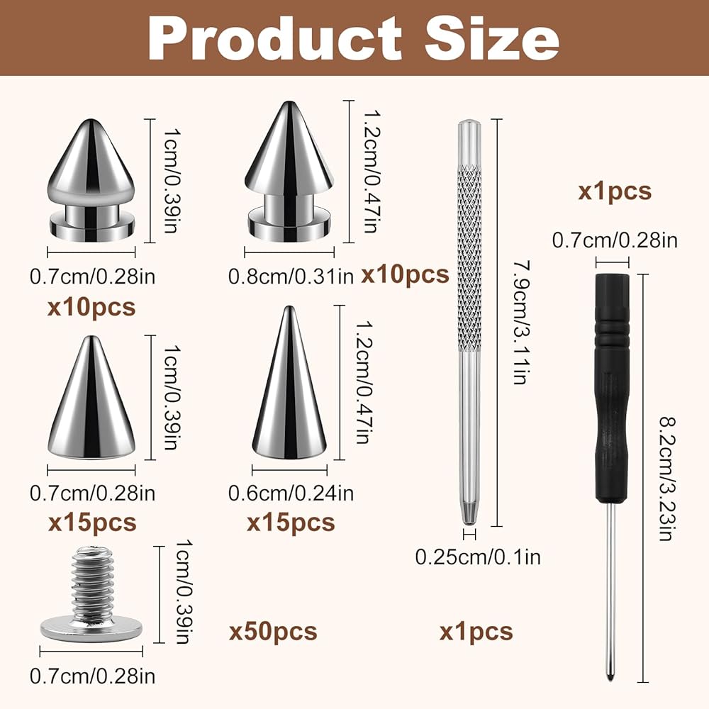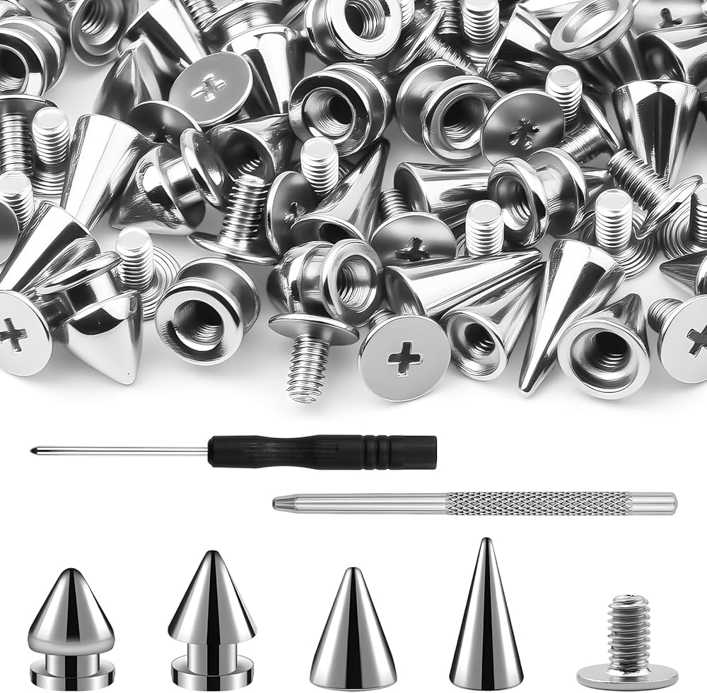 • All-in-One 102Pc Complete Kit - 50 metal cone spikes (4 sizes) + 50 matching screws + 1 punch + 1 screwdriver — no extra purchases needed; everything to start DIY projects immediately (saves time hunting for tools/parts).