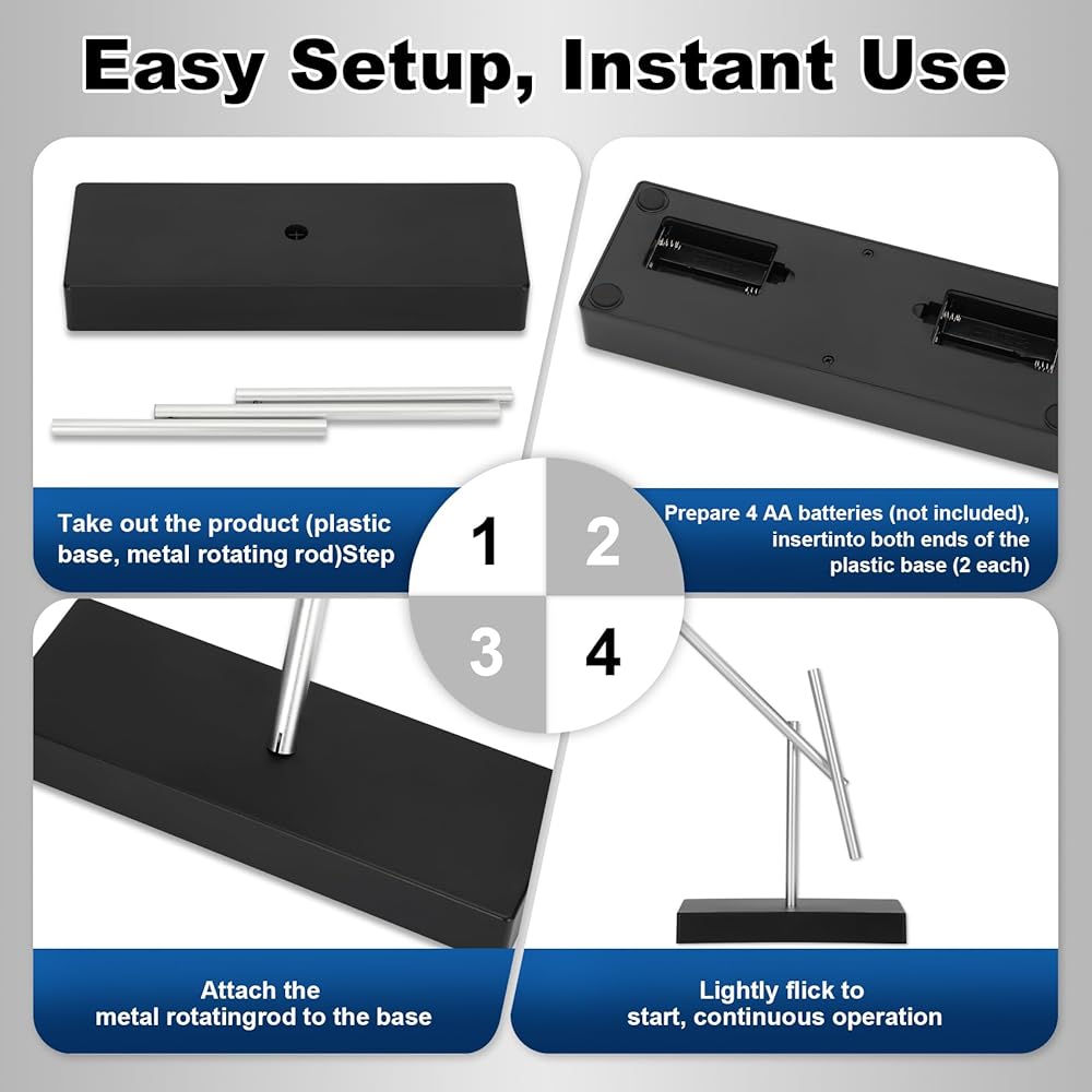 【انقر بخفة للبدء · التشغيل التلقائي المستمر】تنشط هذه العصي المتأرجحة بنقرة لطيفة بسيطة. تعمل ببطاريات 4AA (غير متضمنة) مع نظام طاقة مطور. لا حاجة إلى تدخل خارجي بعد بدء التشغيل: تعمل قضبان البندول بشكل مستمر وسلس، مما يمنع عمليات التشغيل/التوقف المتكررة ويظهر السحر الديناميكي بثبات.