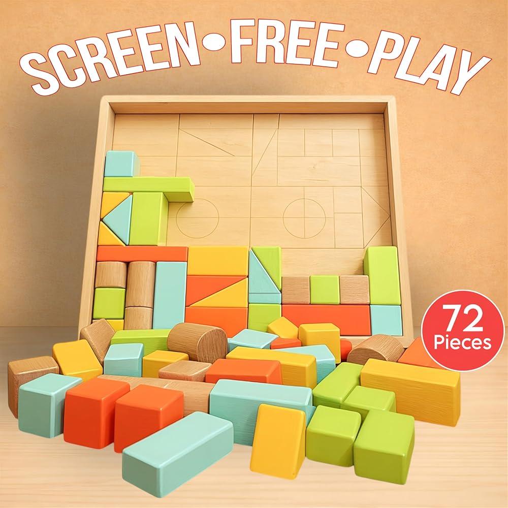 مجموعة مكعبات بناء من الخشب الطبيعي، 72 قطعة من ألوان الباستيل مكعبات بناء قلعة مع صينية تخزين، ألعاب تعليمية للعلوم والتكنولوجيا والهندسة والرياضيات للأطفال، نظام لعب معماري إبداعي وخالي من الشاشة