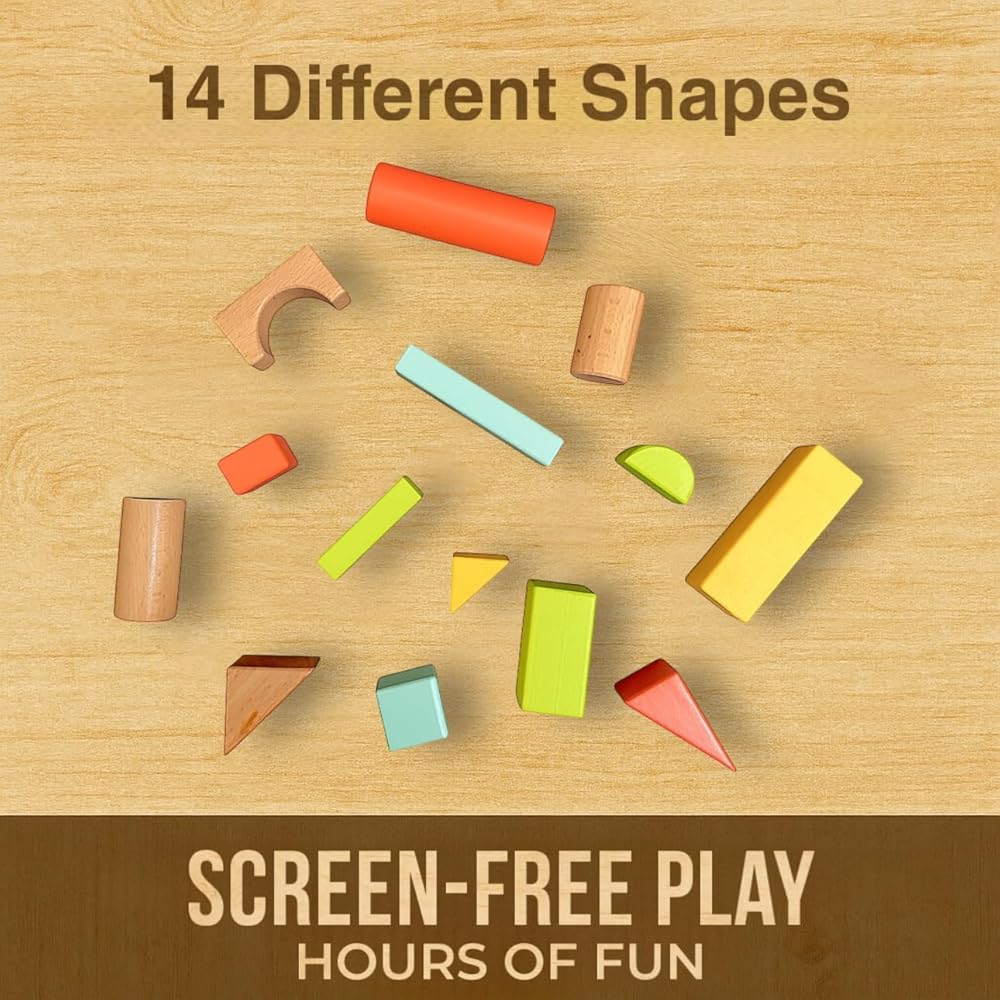 المجموعة الكاملة: مكعبات بناء خشبية طبيعية مكونة من 72 قطعة بما في ذلك أشكال مختلفة مثل الأسطوانات والمثلثات والمستطيلات، مثالية لإنشاء القلاع والهياكل