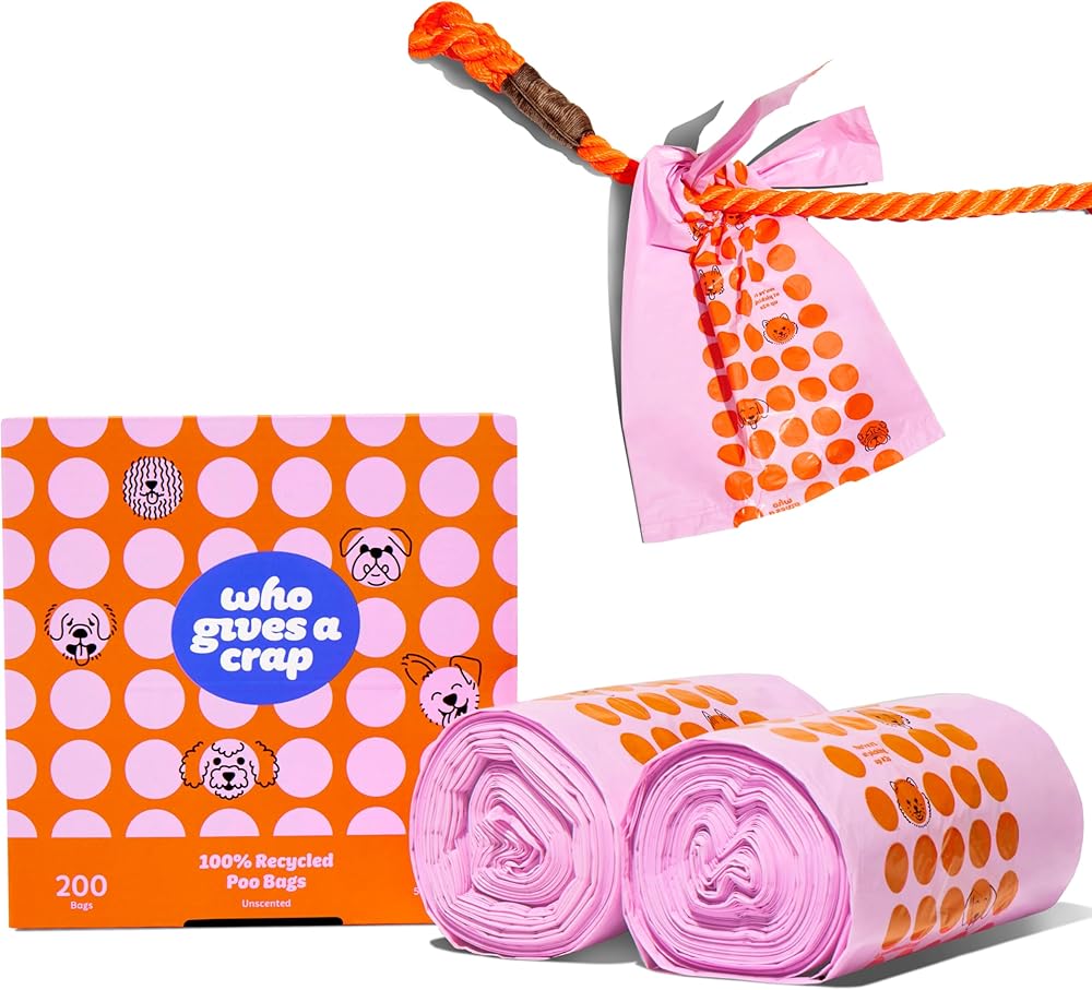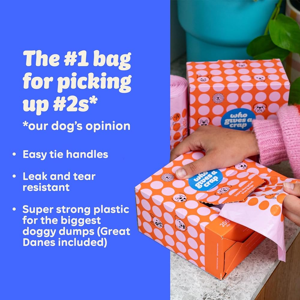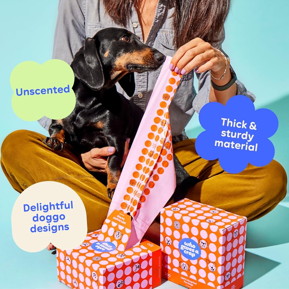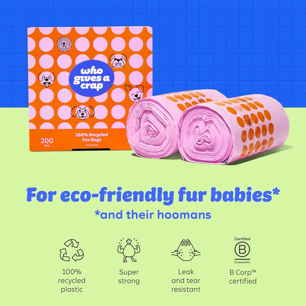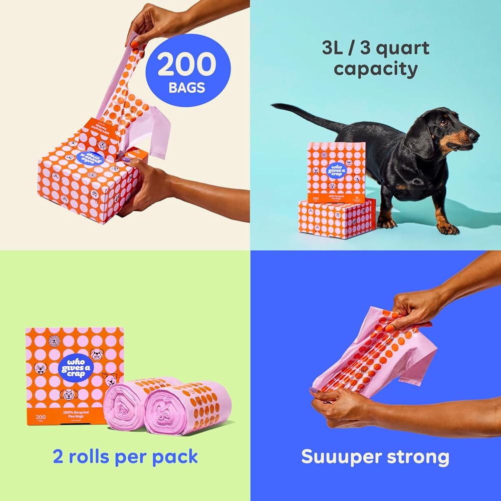 أكياس نفايات الحيوانات الأليفة المعاد تدويرها بنسبة 100% من Who Gives a Crap، عدد 200، سعة 3 لتر / 3 كوارت، مصممة للمساعدة في مقاومة التسربات والتمزقات، وأكياس فضلات الكلاب الصغيرة والكبيرة، وأكياس قمامة مستدامة غير معطرة للكلاب