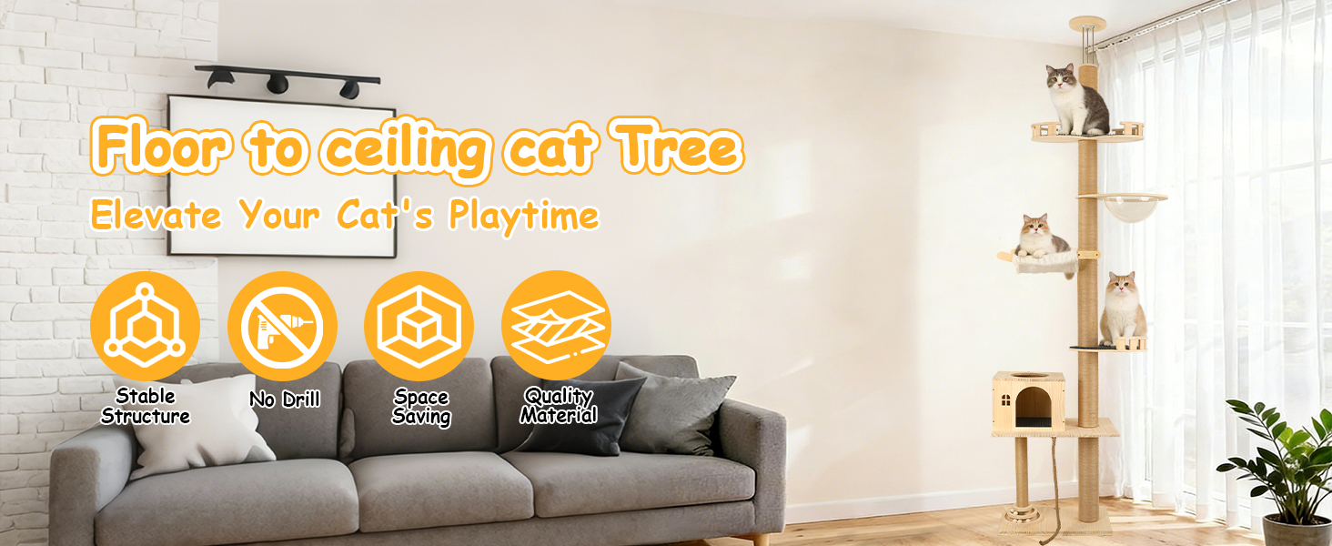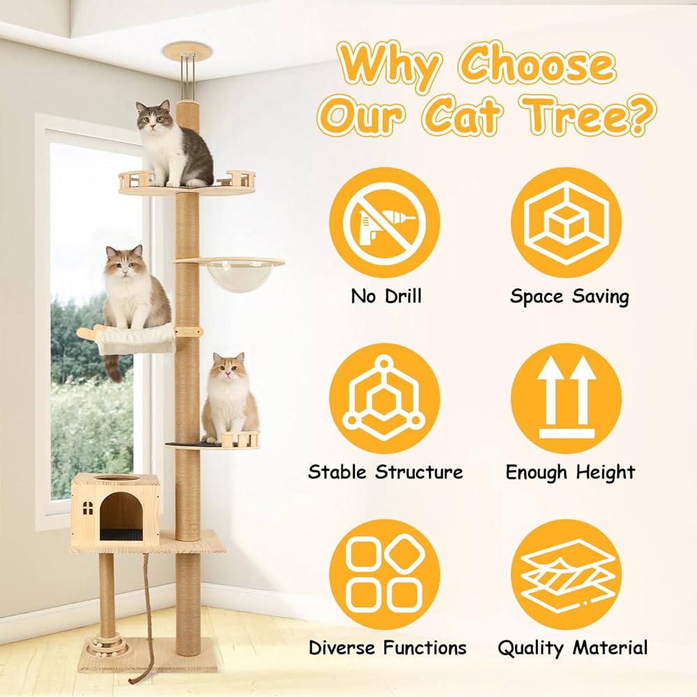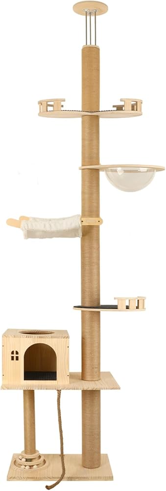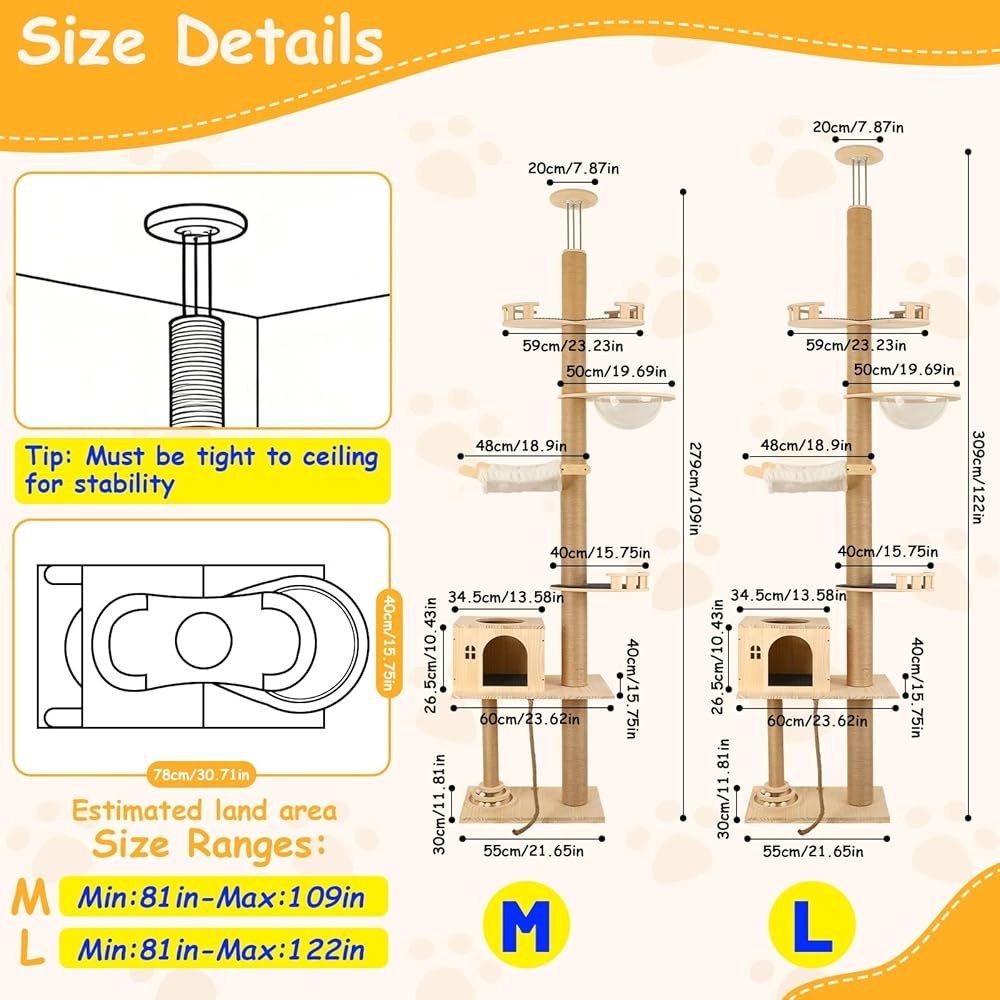 توفير المساحة وارتفاع قابل للتعديل: تناسب شجرة القطط هذه الممتدة من الأرض إلى السقف مساحتك تمامًا - حيث يمكن تعديلها من 81 بوصة إلى 122 بوصة لتتناسب مع غرفتك! يوفر تصميمها الذكي والمدمج مساحة أرضية ثمينة بينما يمنح قطتك مملكة عمودية كاملة للحكم