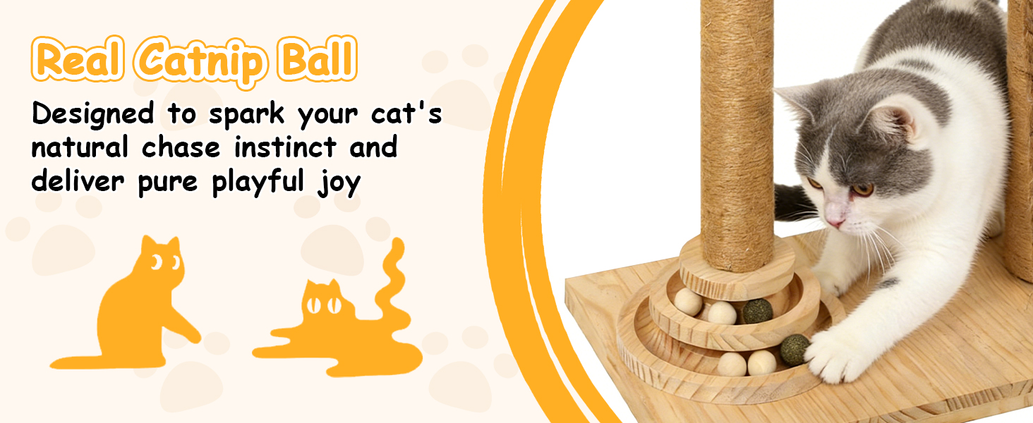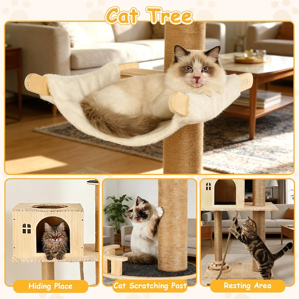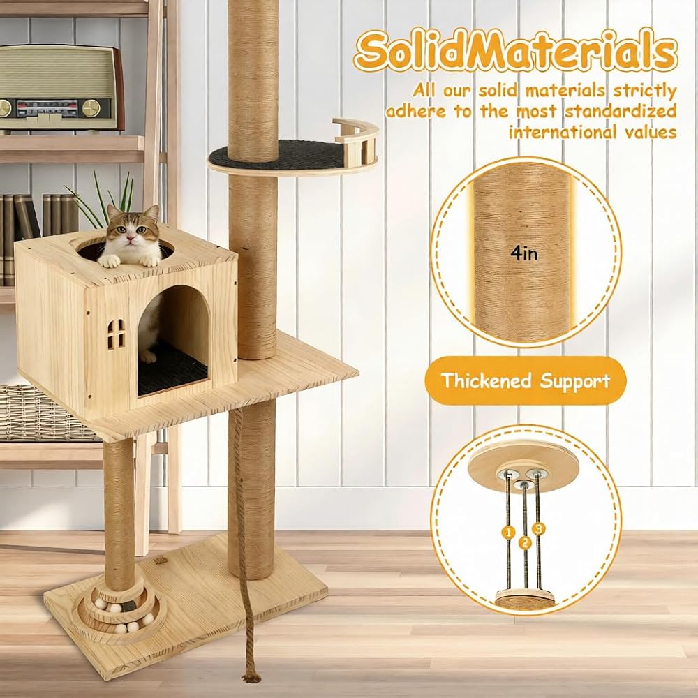 خدش السماء واستقرار الصخور الصلبة: لا مزيد من خدش الأريكة! برج شجرة القطط الخشبي الخاص بنا للقطط الداخلية ملفوف بحبل من السيزال المتين، مثالي للمخالب السعيدة. بالإضافة إلى ذلك، بفضل أعمدةها السميكة للغاية وقاعدتها القوية (بالإضافة إلى 3 نوابض علوية)، فهي مستقرة وآمنة للغاية - حتى بالنسبة للقطط الكبيرة!
