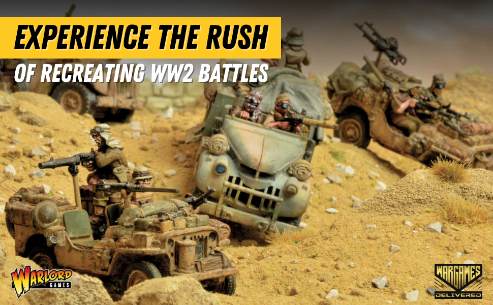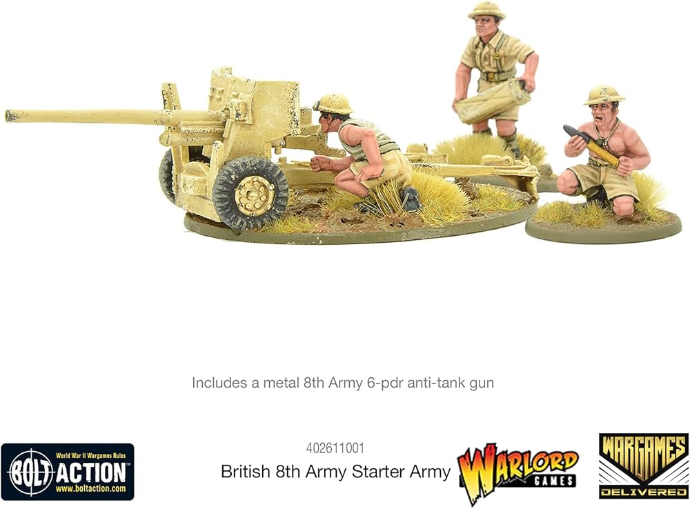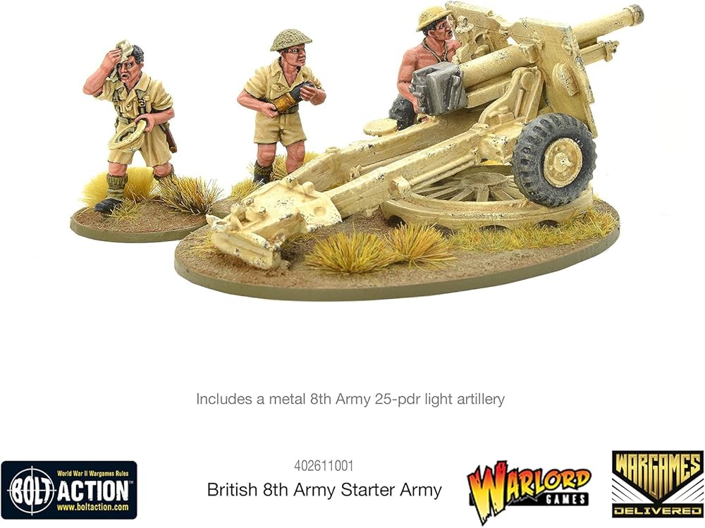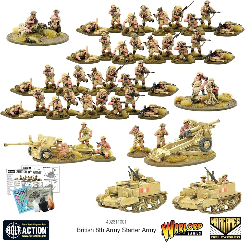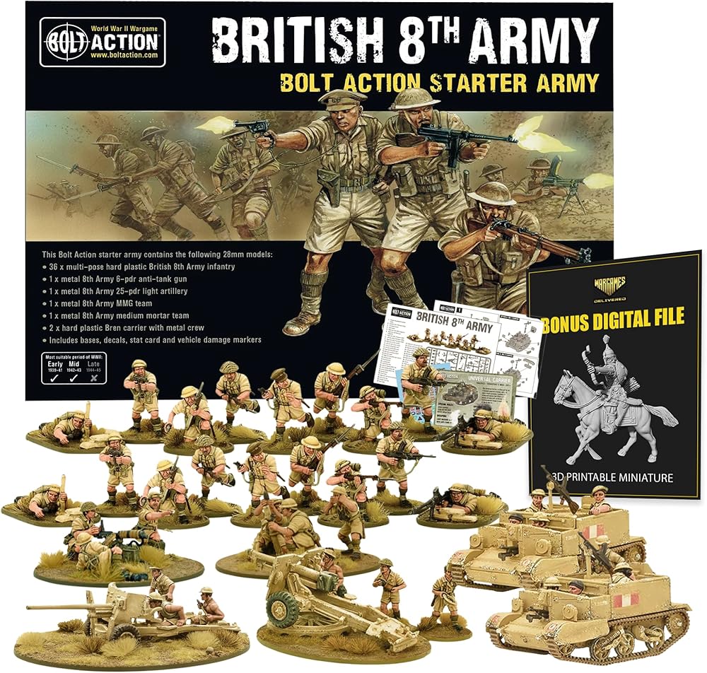 تم تسليم ألعاب الحرب - منمنمات عمل بولت من ألعاب لورد، مجموعة بداية الجيش البريطاني الثامن مع تنزيل STL مصغر إضافي - رجال الجيش البلاستيكي بمقياس 28 مم من الحرب العالمية الثانية لألعاب الحرب