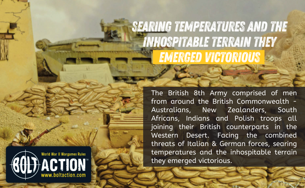 قم ببناء جيشك البريطاني لإعادة إنشاء معارك ملحمية: يتألف الجيش البريطاني الثامن من رجال من جميع أنحاء الكومنولث البريطاني - الأستراليون والنيوزيلنديون وجنوب إفريقيا والهنود والقوات البولندية، جميعهم ينضمون إلى نظرائهم البريطانيين في الصحراء الغربية. في مواجهة التهديدات المشتركة للقوات الإيطالية والألمانية، ودرجات الحرارة المرتفعة والتضاريس غير المضيافة، خرجوا منتصرين.