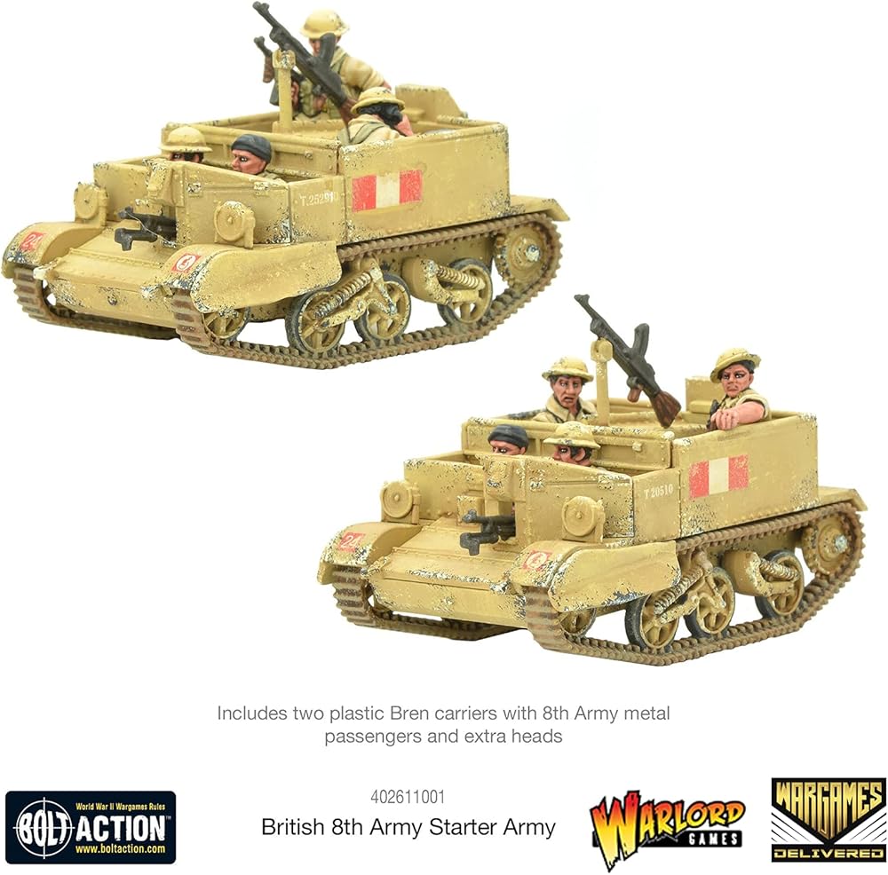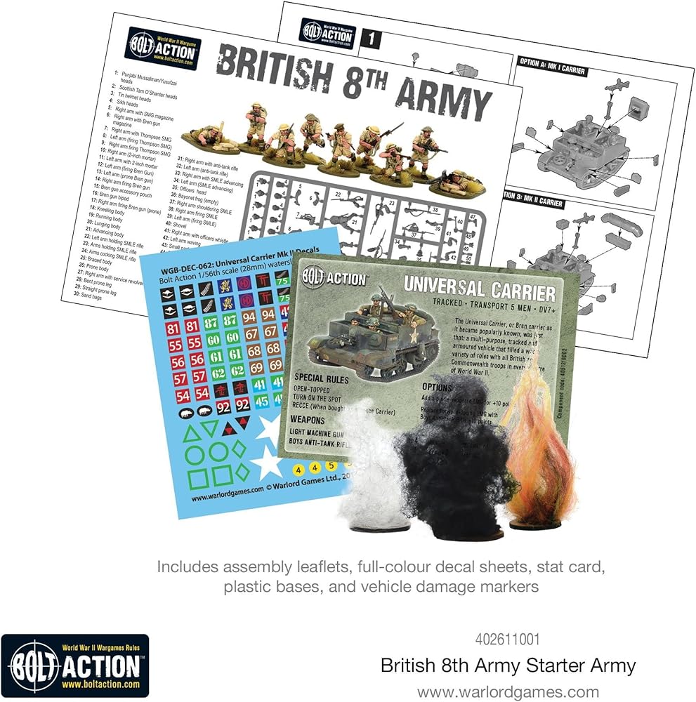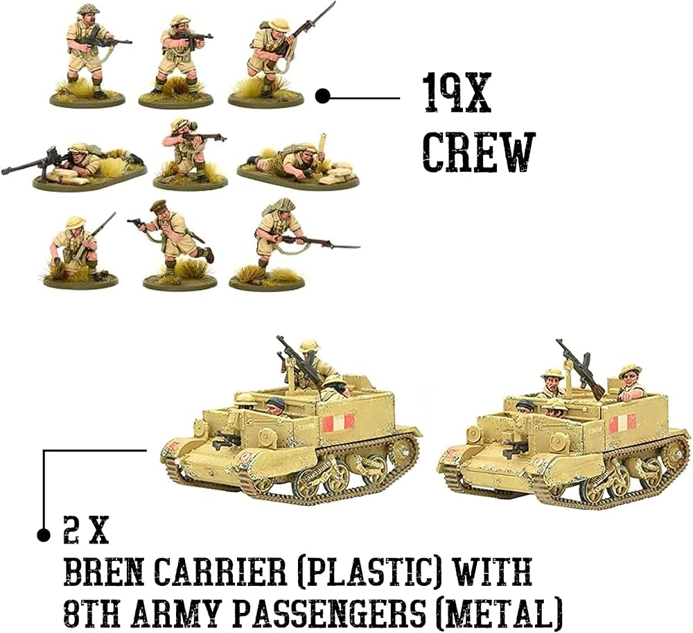 مجموعة الجيش الثامن الأكثر توسعًا: مجموعة بداية كاملة تتضمن 36 × مشاة الجيش الثامن البريطاني (بلاستيك)، 1 × مدفع مضاد للدبابات من الجيش الثامن 6 مدفع (معدن)، 1 × مدفعية خفيفة من الجيش الثامن 25 مدفع (معدن)، 1 × فريق فيكرز MMG من الجيش الثامن (معدن)، 1 × فريق هاون متوسط 3 بوصة من الجيش الثامن (معدن) و2 × حاملة Bren (بلاستيكية) مع ركاب الجيش الثامن (معدنية) تأتي أيضًا مع تعليمات التجميع والطلاء، وبطاقات الإحصائيات، وأوراق الملصقات الملونة بالكامل، وعلامات تلف المركبات، وقواعد بلاستيكية.