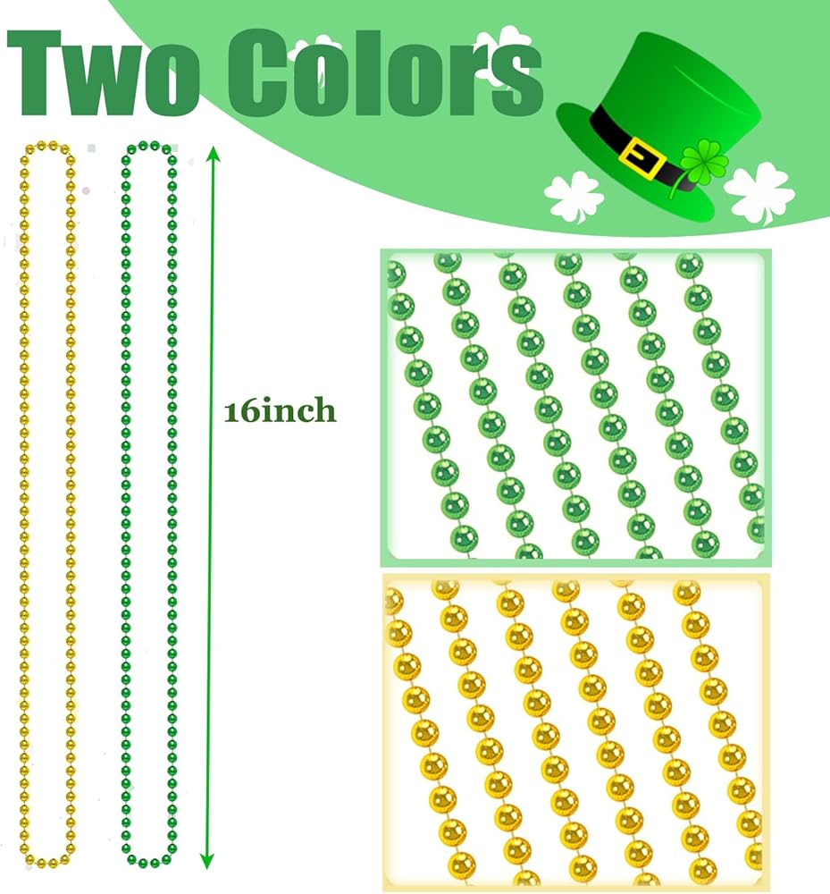 • 14PCS St. Patricks Day Beads Necklace, 31.5" Mardi Gras Beads Christmas Necklaces Greenx7pcs, Goldx7pcs Irish Saint Patricks Necklaces for St. Patrick's Day Mardi Gras Parade Throws Birthday Party Favors